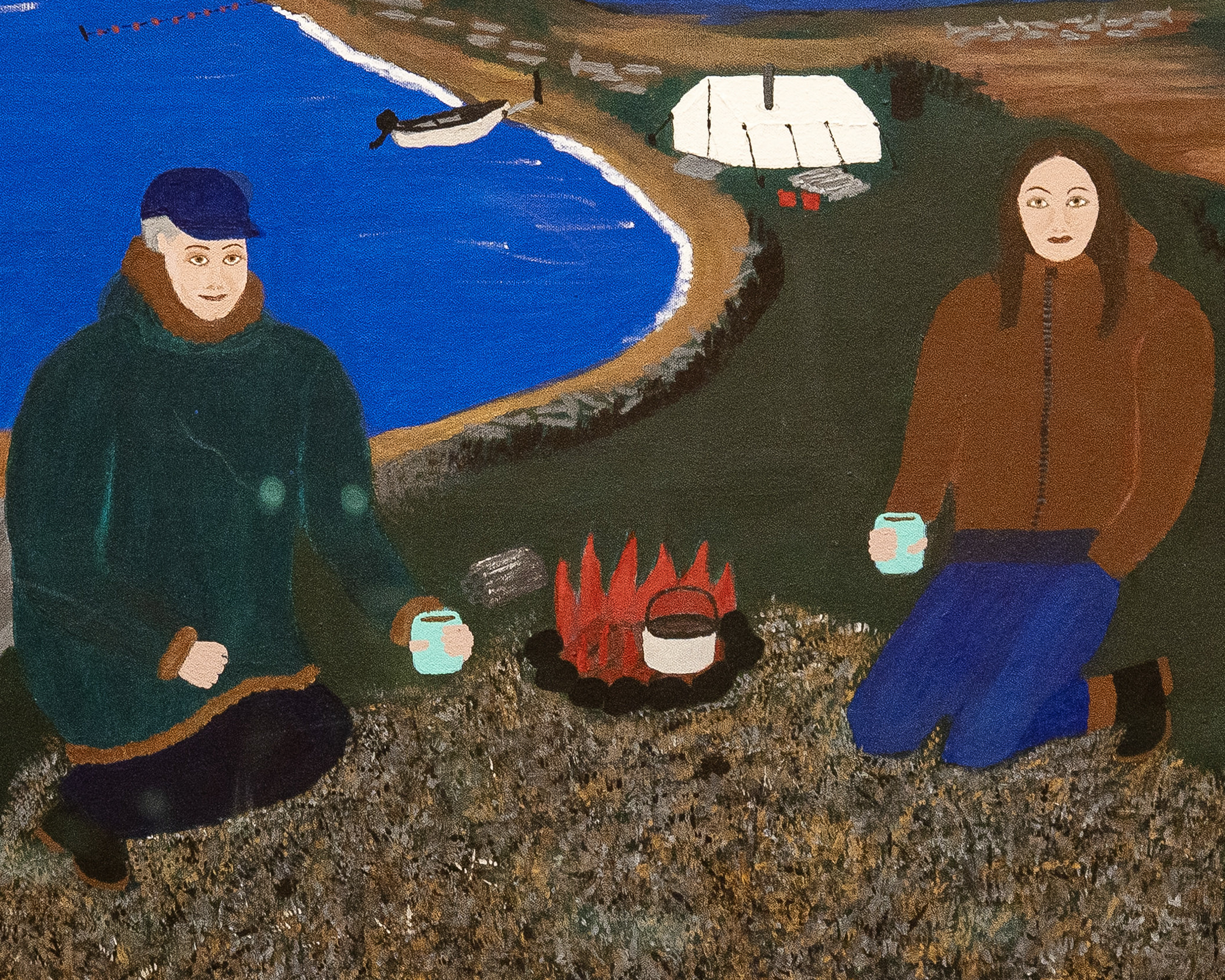 Fall Hunting with Father is a self-portrait of artist Agnes “Aggi” Ettagiak hunting with her father on Tapqaq Beach near Tuktoyaktuk. Commonly known as Tuk, the Inuvialuit hamlet is on the Arctic coast of the Northwest Territories.