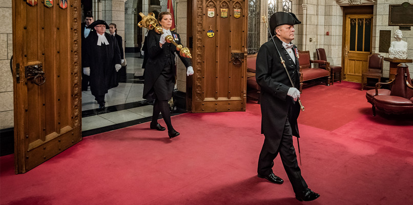 This carved walnut wood desk is used by the Usher of the Black Rod in the Senate Chamber. The Usher is the Senate’s most senior protocol officer and serves as the Queen’s personal attendant and messenger in Parliament. The desk is installed along the central corridor of the Chamber, close to the entrance.