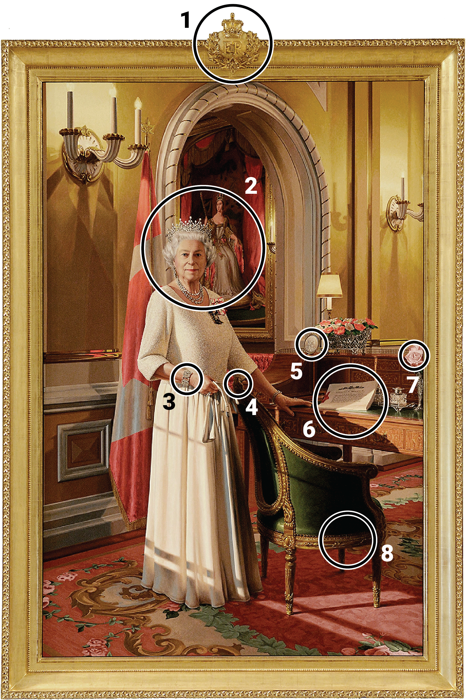1. The gilt basswood frame, constructed by Toronto-based framers Elizabeth and Peter Porebski, is topped with the Queen’s Diamond Jubilee Emblem, designed by the Canadian Heraldic Authority and carved by sculptor Jamie Richards, the artist’s son.