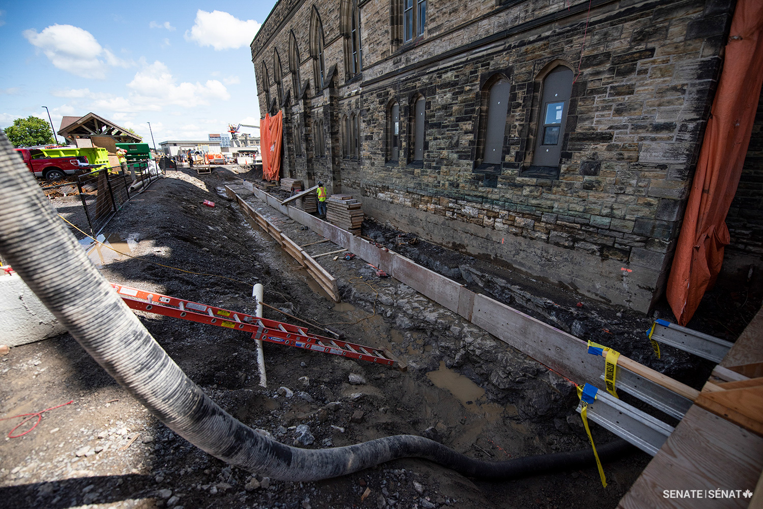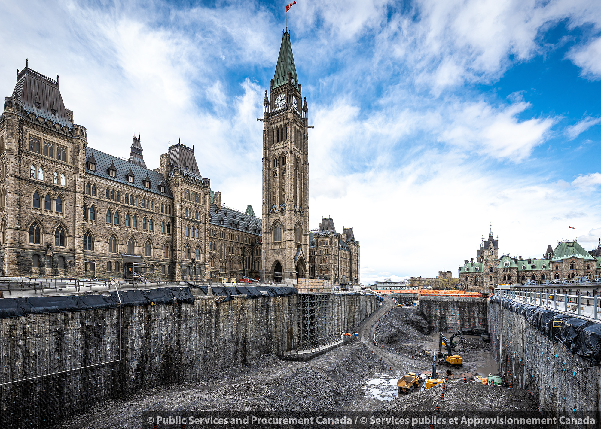 Upgrading Centre Block to meet modern seismic standards involves excavation work around the building’s foundation. The entire building will eventually float on a grid of steel and reinforced concrete, which will rest on shock-absorbing base isolators.