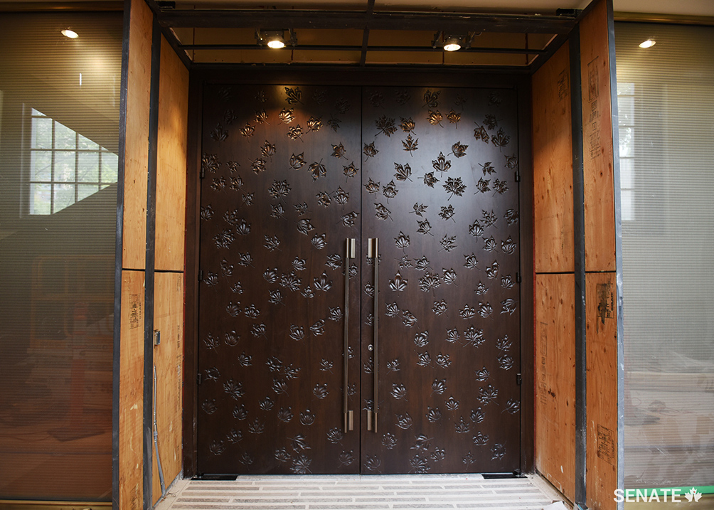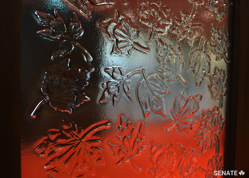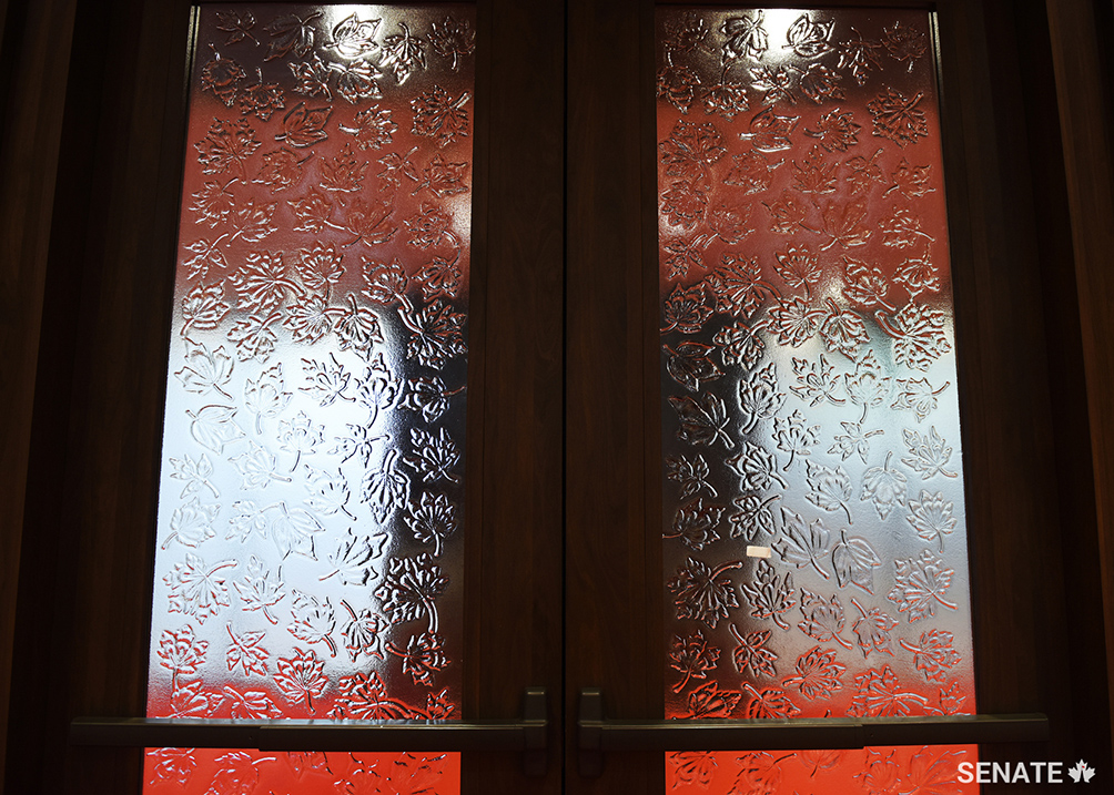 Walnut-wood doors open into the Senate Chamber. They are decorated with a pattern of maple leaves — a symbol of the country that Parliament serves. The doors were carved by machines at a workshop in Quebec’s Beauce region, south of Québec City.