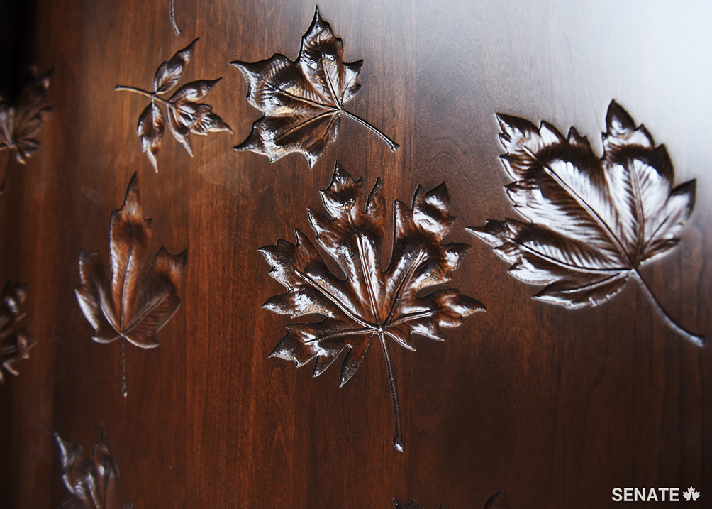 Carved Canada flag walnut-wood panels hang on the east wall of the Senate Chamber. The flags form a backdrop to the thrones in the new Senate Chamber. The curve and contour of the carvings give a sense of movement, as though the flags are fluttering in the wind.