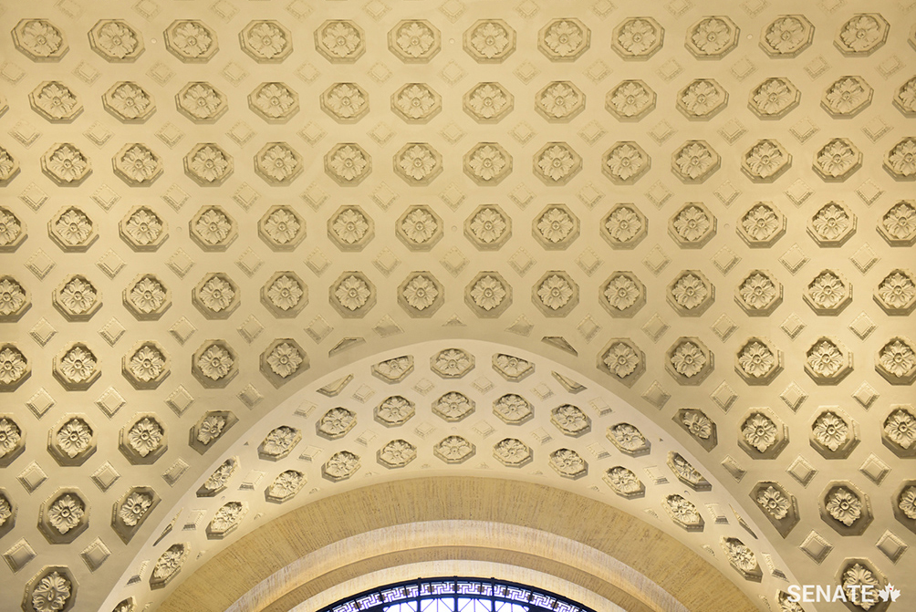The foyer to the temporary home of Canada's Senate has a heritage plaster ceiling that was rehabilitated from the building's days as Ottawa’s train station.