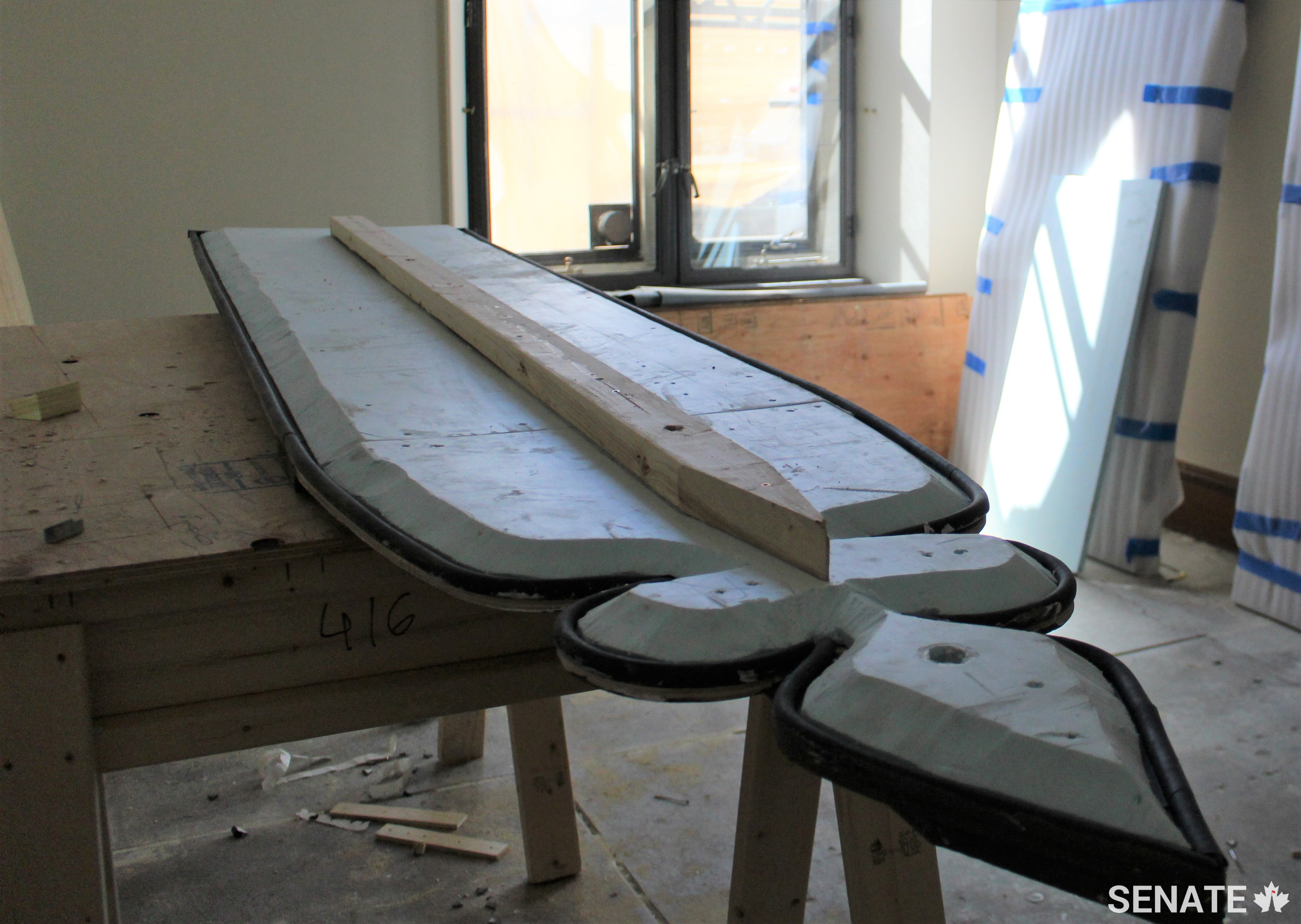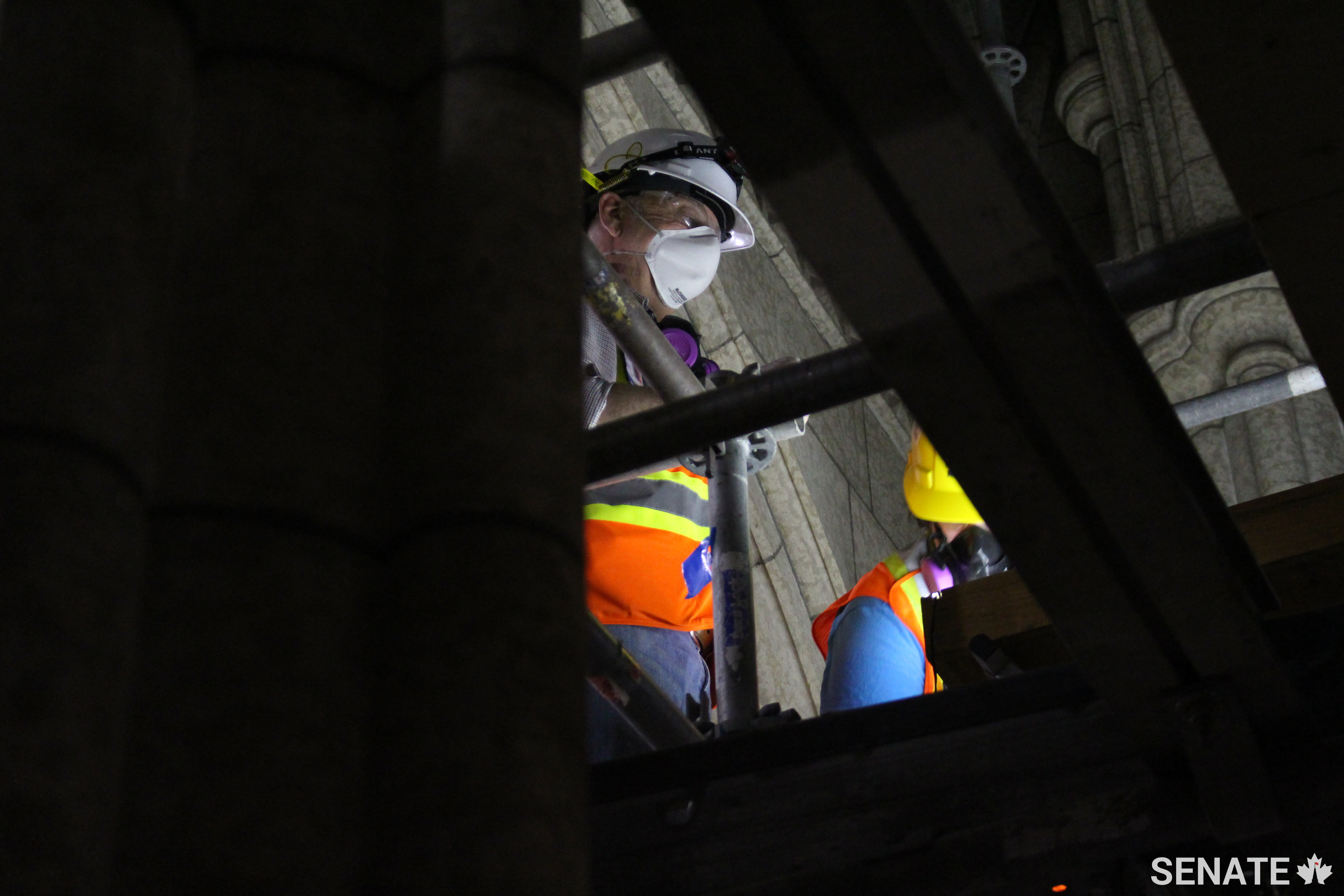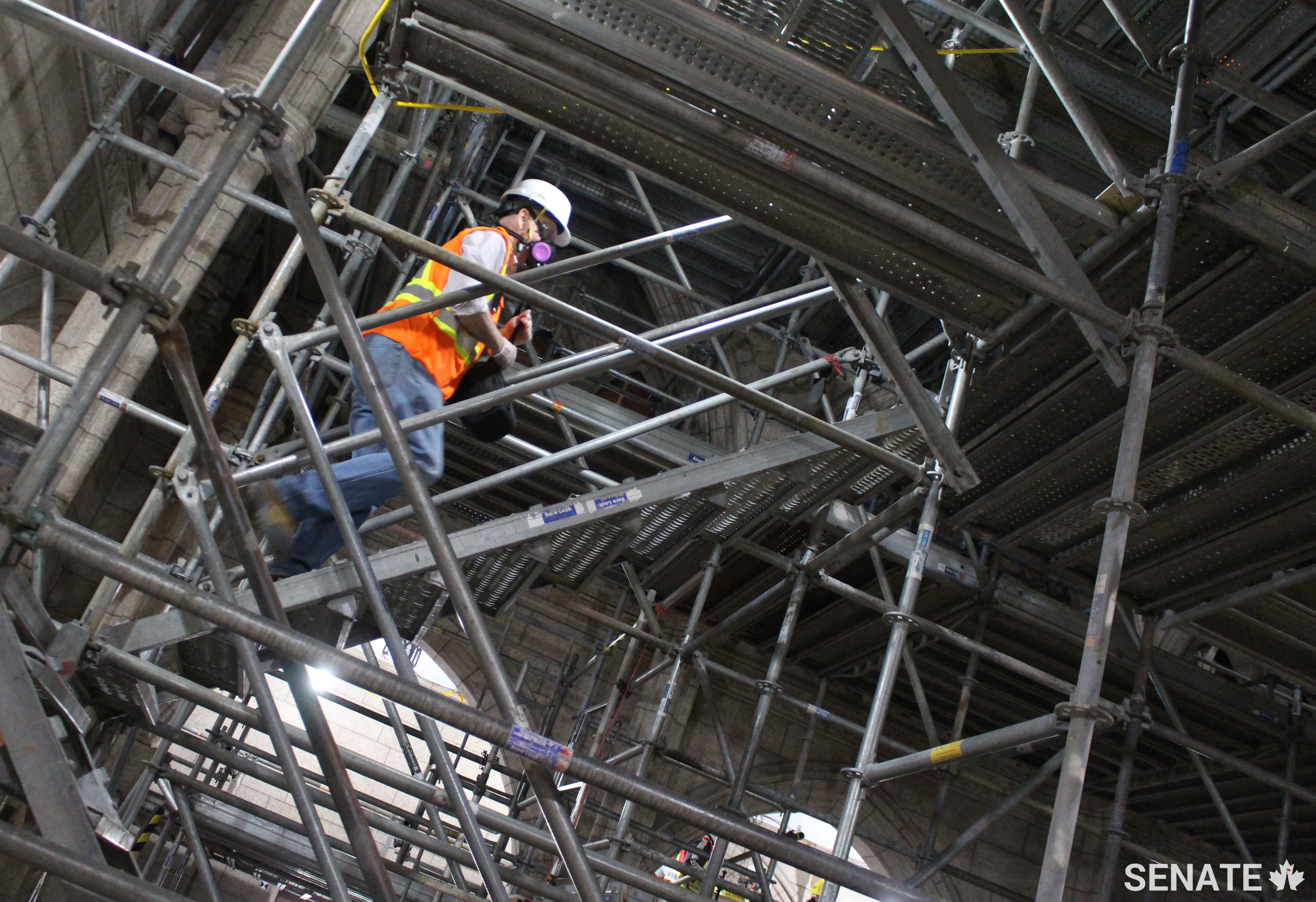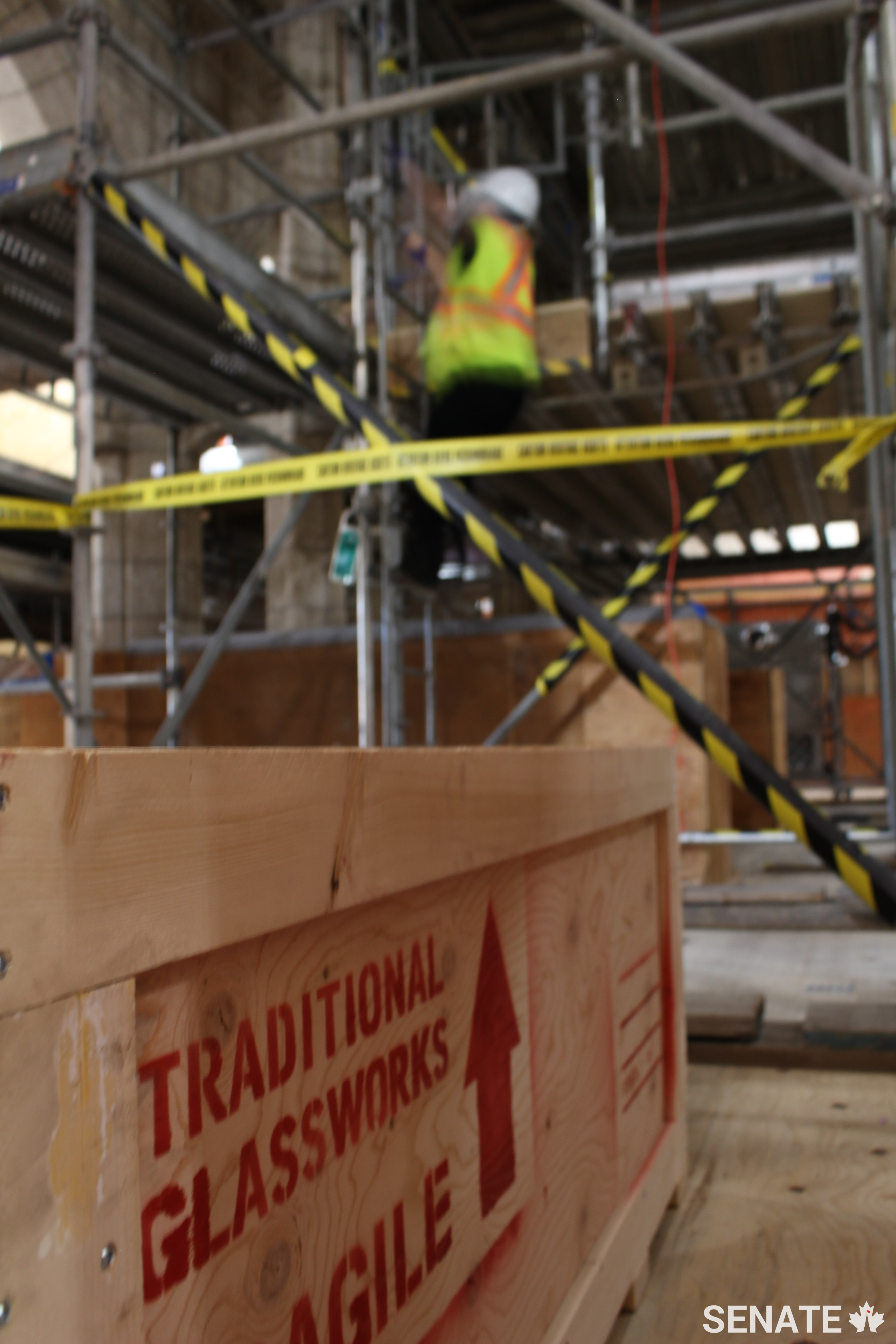 The Senate foyer looks a bit different than it used to. Plywood cladding has been used to protect Centre Block’s historic features during rehabilitation work, and scaffolding is everywhere. The Diamond Jubilee Window is just visible as a soft glow in the centre of the frame.