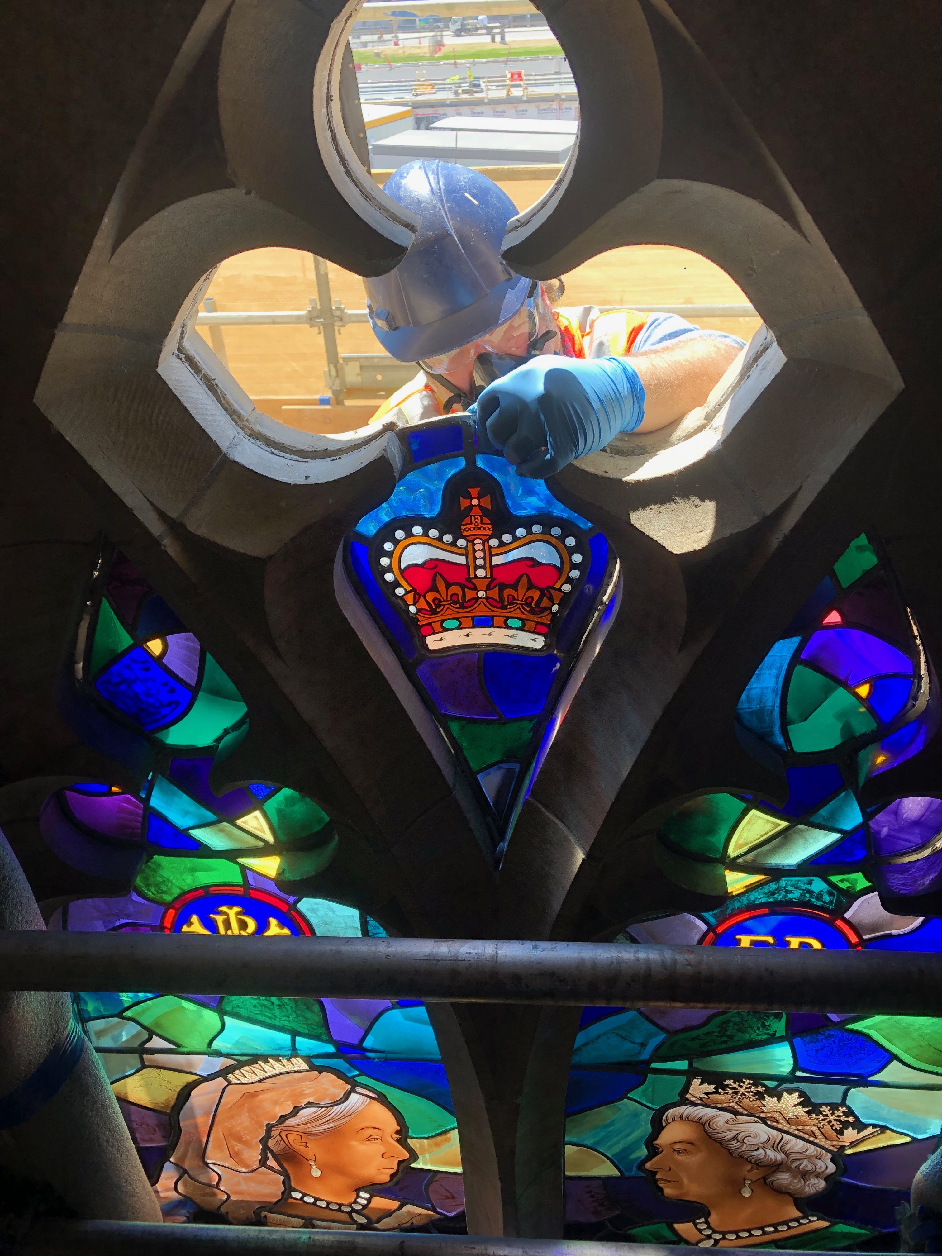 A worker returns to the scaffolding as the first section of the jubilee window nestles safely in its wooden box. The window proved to be in good shape — all it needs is a light vacuum with a soft brush and a gentle rub clean with a cotton cloth.