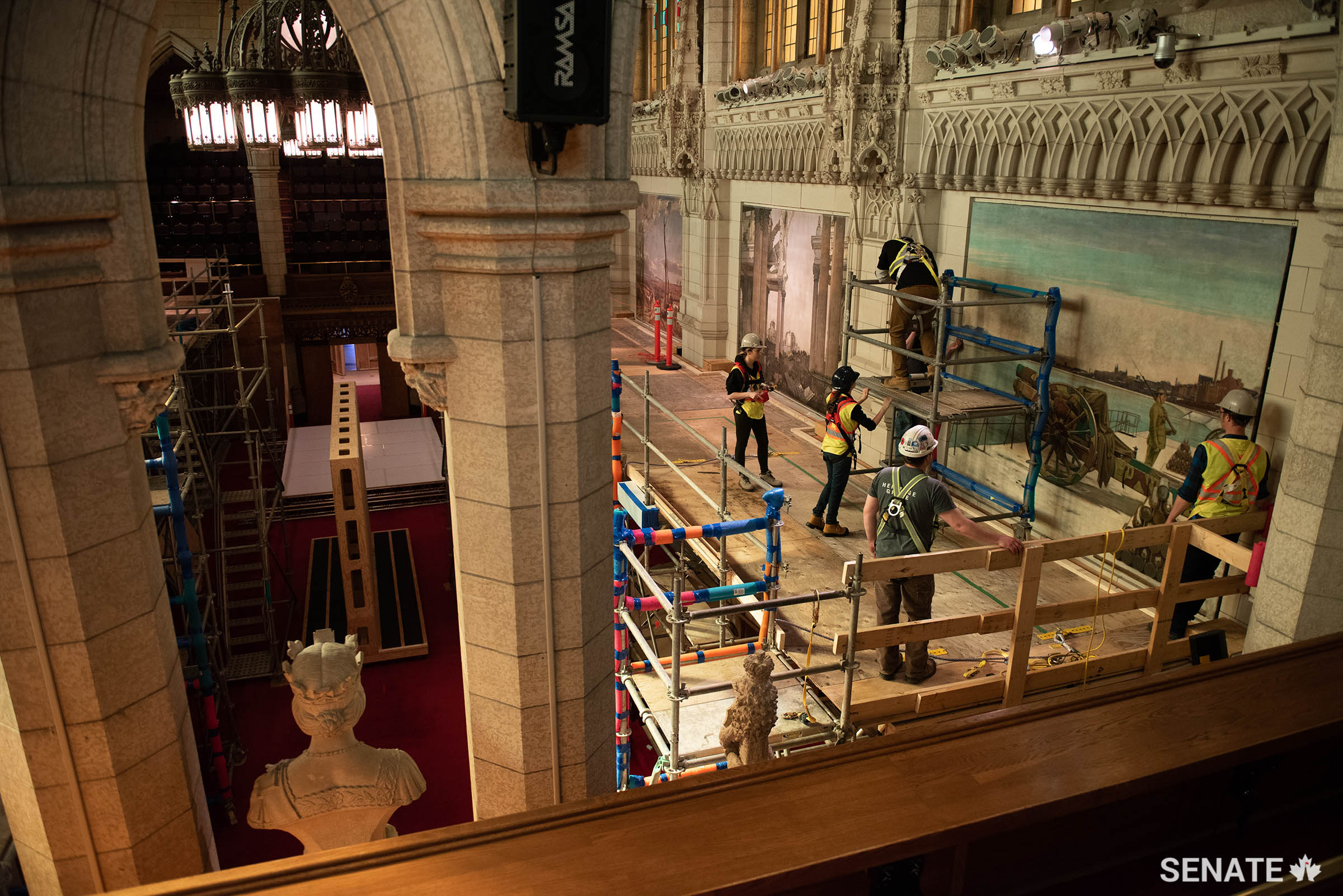 The Senate Chamber in Centre Block is normally bustling with clerks, pages and senators and echoing with debate. But in May and June 2019, it was crammed with scaffolds, hoists and enormous easels. It looked like Leonardo da Vinci’s workshop, not Canada’s Upper House of Parliament.