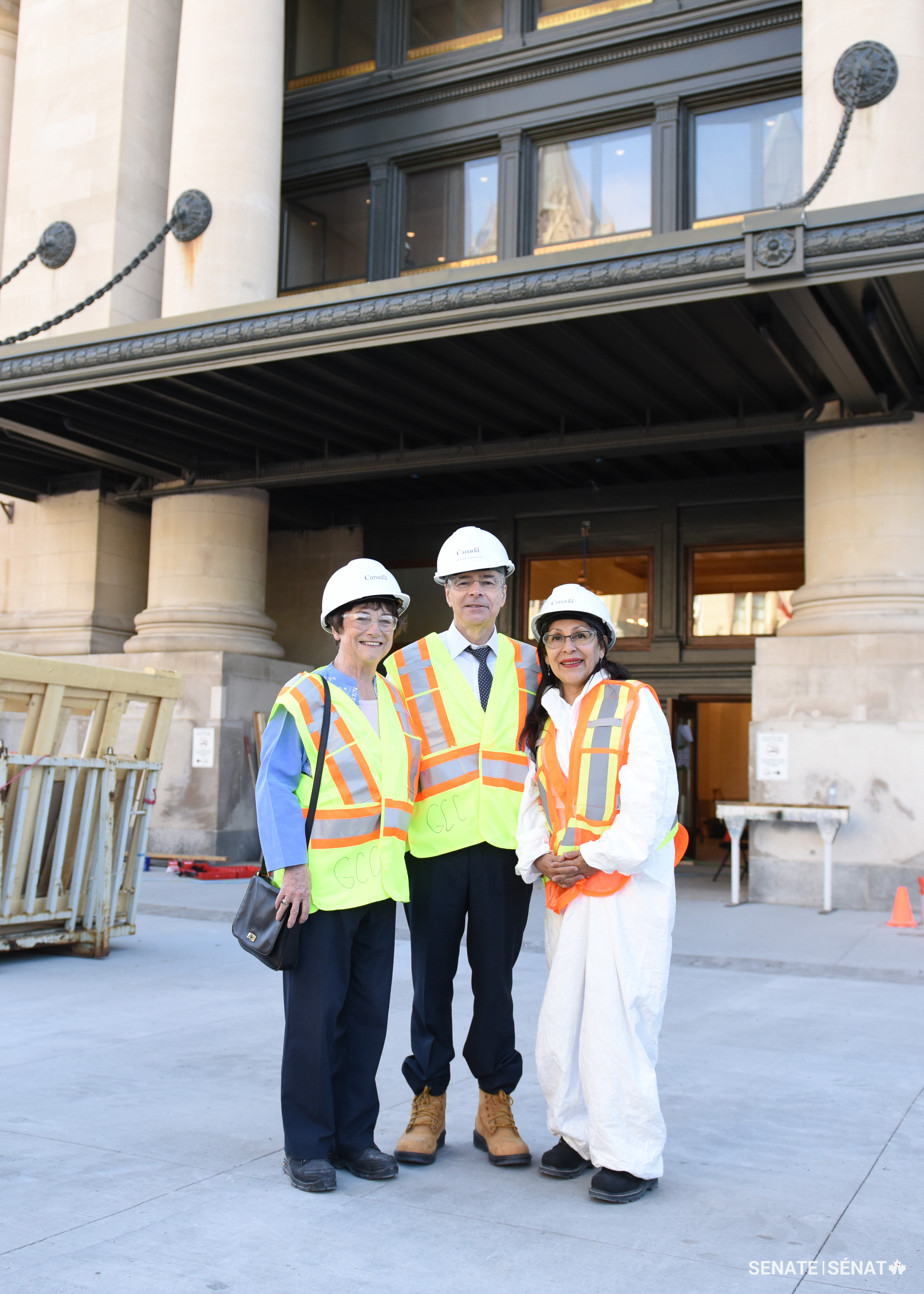 From left, former senator Diane Griffin, LTVP Subcommittee member Senator Pierre J. Dalphond and Senator Rosa Galvez witness the restoration of the Senate of Canada Building during a site visit on June 12, 2018.