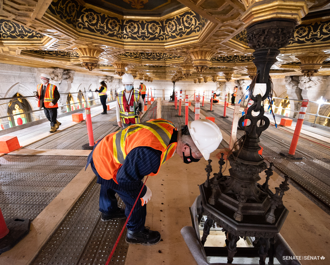 Senators — including LTVP Subcommittee member Senator Don Plett — get a rare, close-up view of the coffered ceiling and chandelier suspension system in Centre Block’s Senate Chamber during a site visit on October 28, 2020.