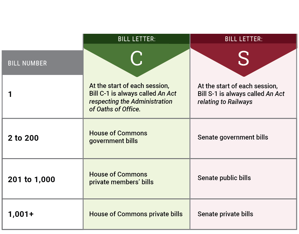 When a bill originates in the Senate, the letter “S” is placed before the assigned number. When the letter “C” precedes the number, it means the bill was introduced first in the House of Commons.