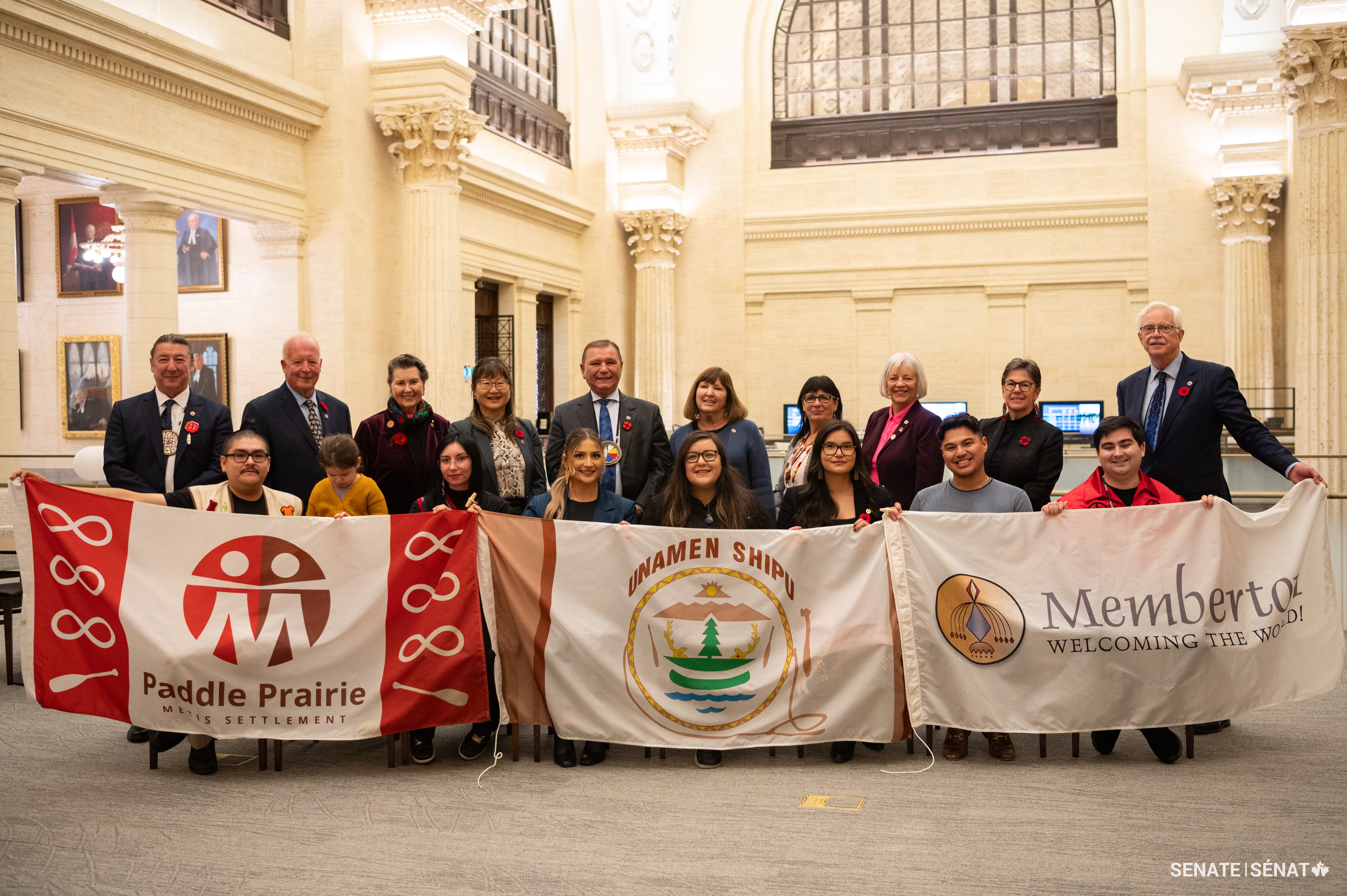Participants of Voices of Youth Indigenous Leaders and senators hold up flags representing some of the participants’ communities. Back row, from left, senators Paul J. Prosper, John M. McNair, Marilou McPhedran, Yonah Martin, Brian Francis, Mary Coyle, Judy A. White, Nancy J. Hartling, Kim Pate and David M. Arnot. Front row, from left, Bradley and Elaya-Utshimashkuess Bacon, Faithe McGuire, Breane Mahlitz, Crystal Starr Lewis, Reanna Merasty, Brett Recollet and Ethan Paul.