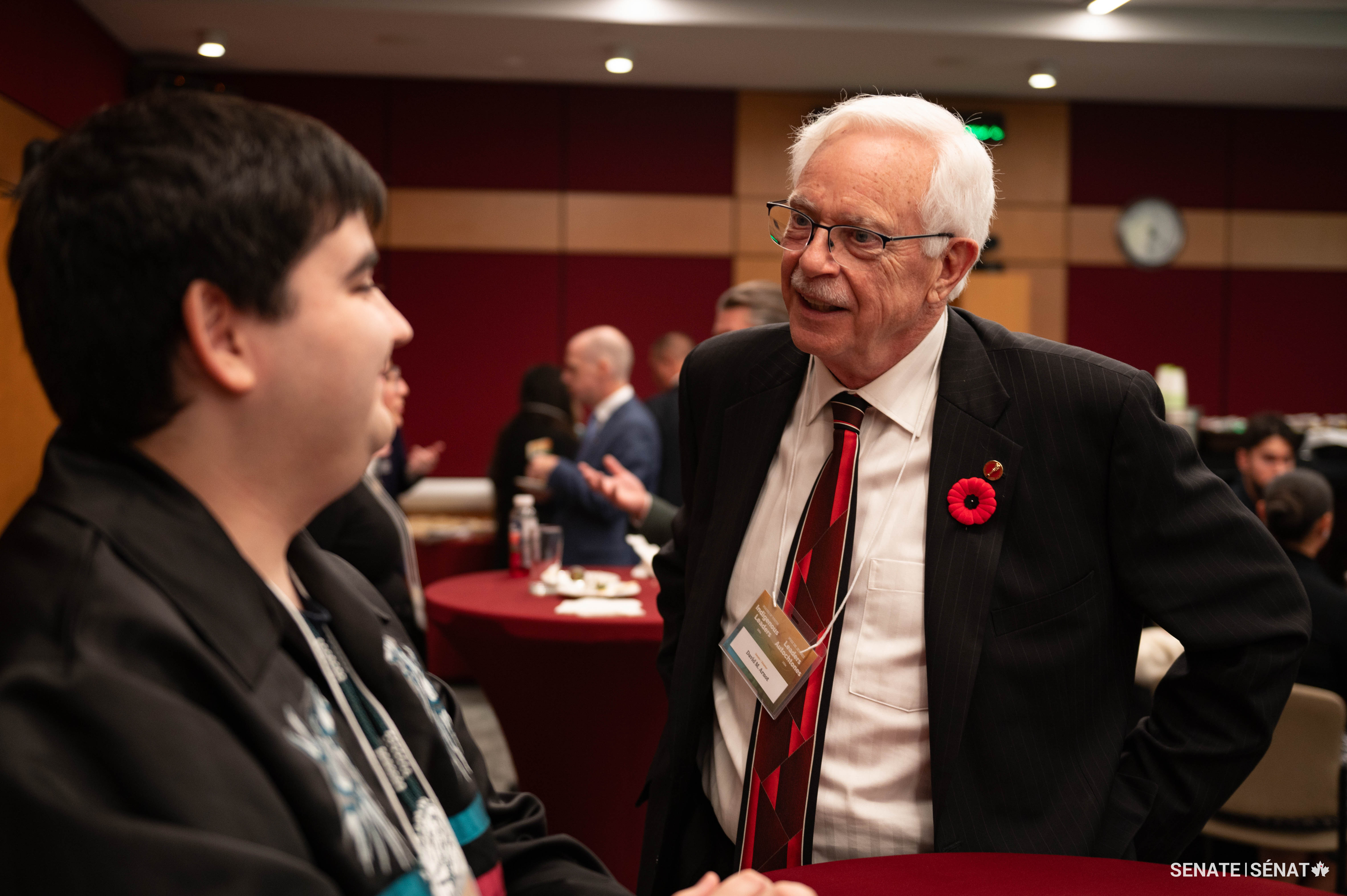 Senator David M. Arnot speaks with Ethan Paul during a welcoming reception.