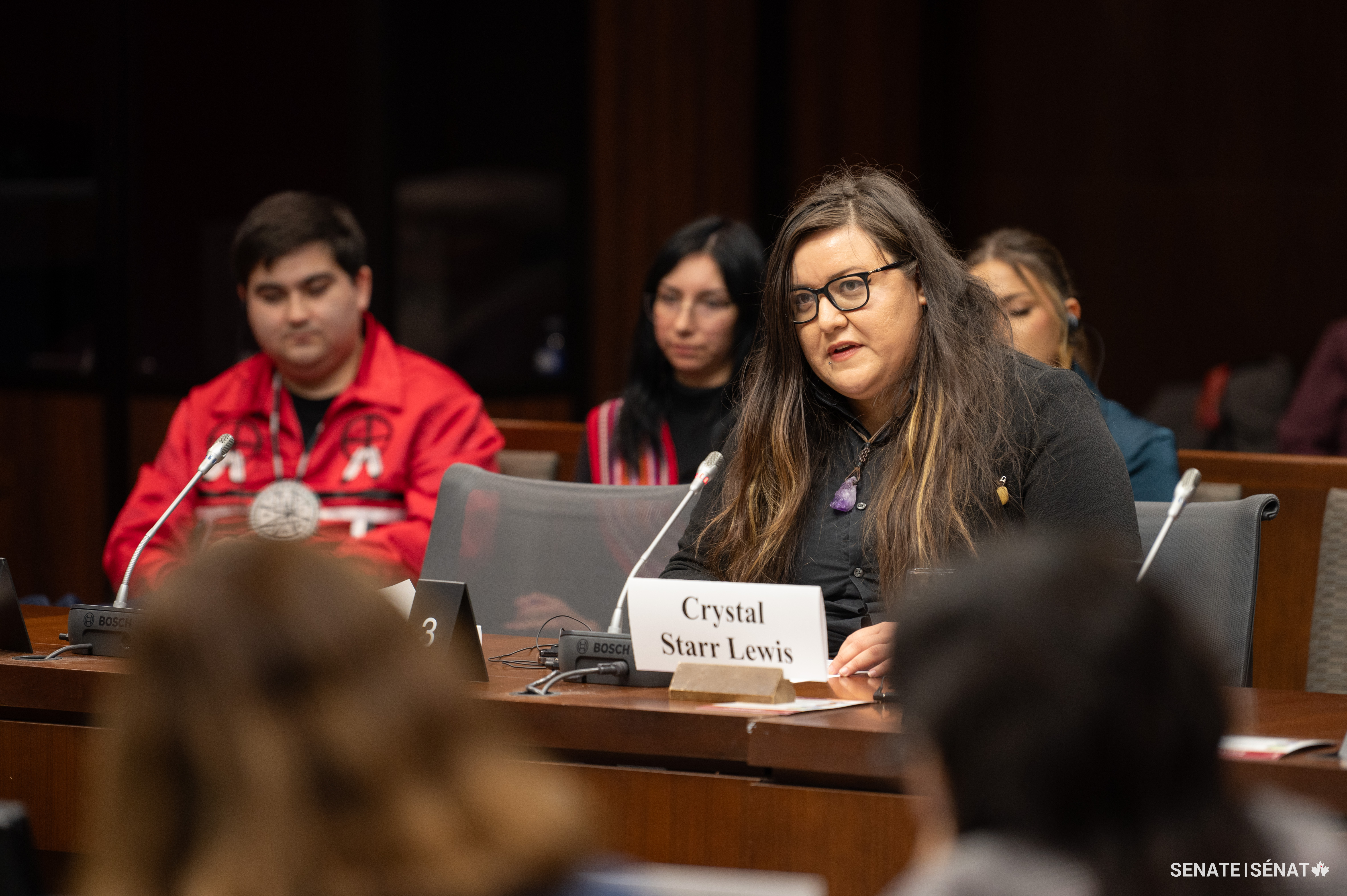 Crystal Starr Lewis tells the committee about the significant challenges she faced in her path to becoming a youth leader, including living in multiple foster homes and facing family drug addictions. “What I’m trying to do is inspire others by being that change,” she said. Before she turned two years old, Crystal Starr Lewis had moved between several different foster homes. By the time she turned six, she had decided to dedicate her life to being a leader, and to living drug and alcohol free. She is now a British Columbia Assembly of First Nations Youth Representative, she has spoken to the United Nations on her anti-trafficking initiatives, she is a first-generation speaker of her language, and she has earned more than 30 awards and certificates. In describing her accomplishments to the committee, Ms. Lewis said they “tell a story of a girl who decided to believe in herself despite her obstacles and challenges.”