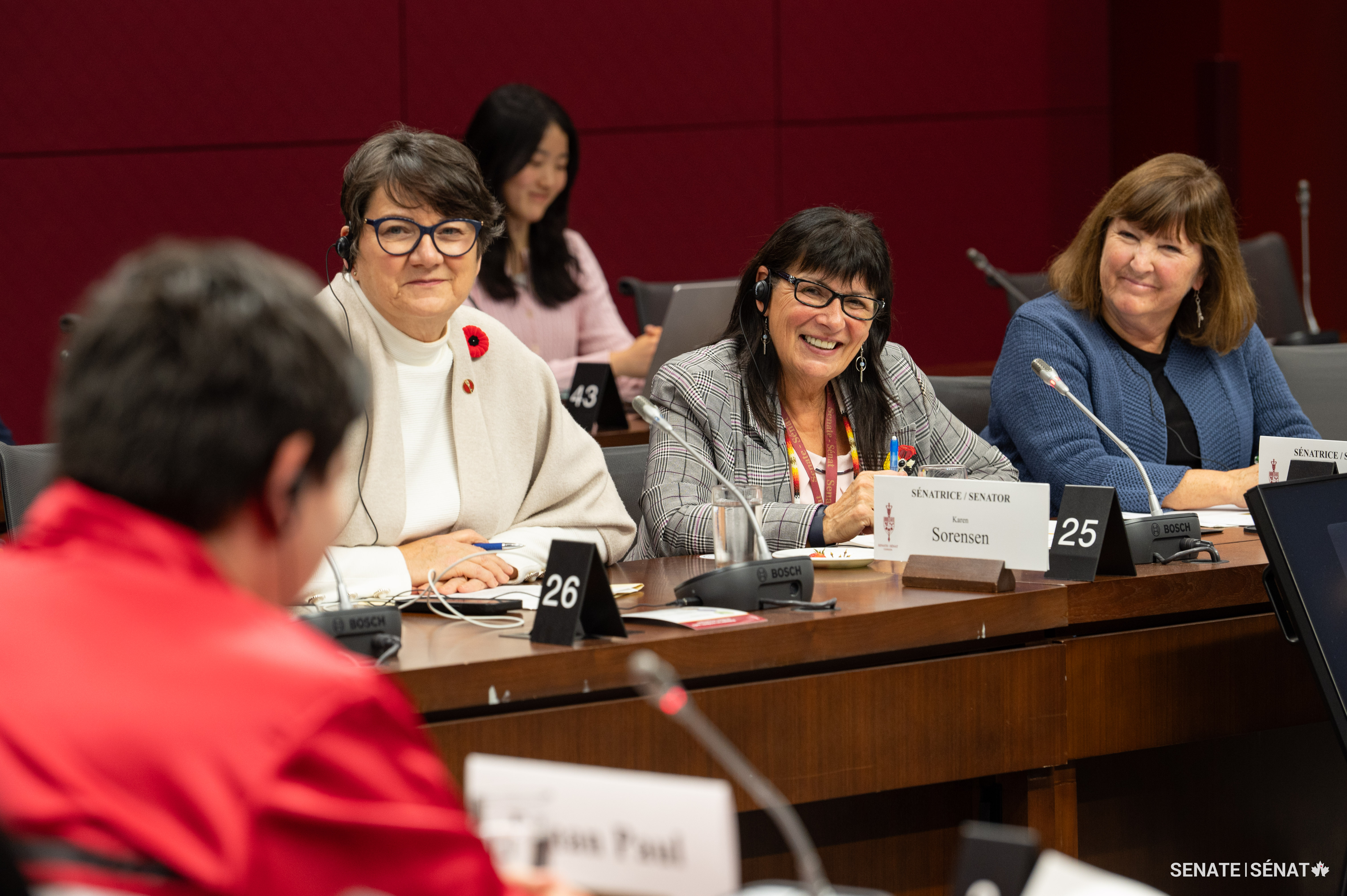 From left, senators Yonah Martin, Nancy J. Hartling and John M. McNair listen to testimony during a Senate Committee on Indigenous Peoples meeting.