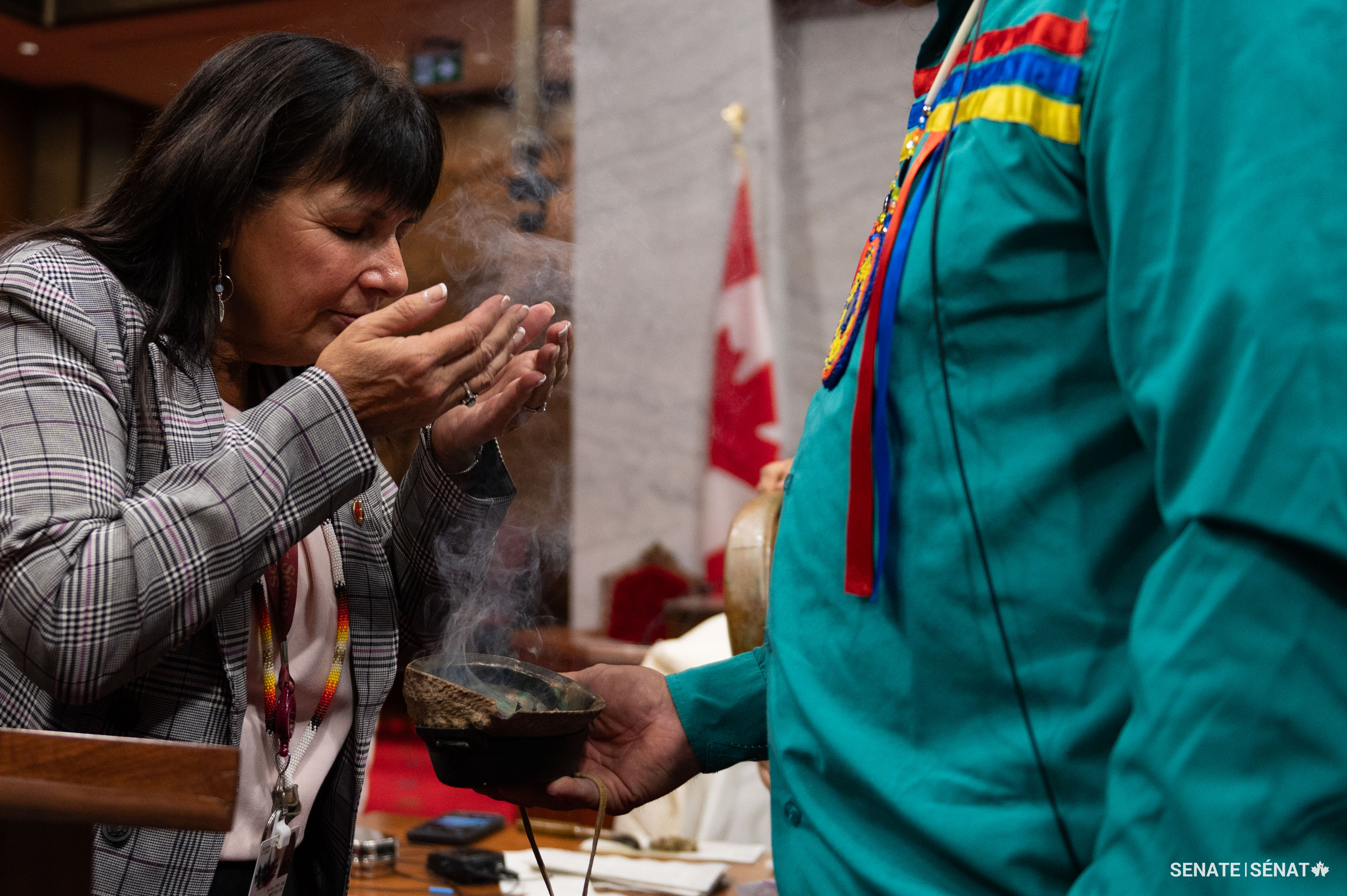 Senator Judy A. White participates in a smudging ceremony at the Senate of Canada Building to launch Voices of Youth Indigenous Leaders 2024.