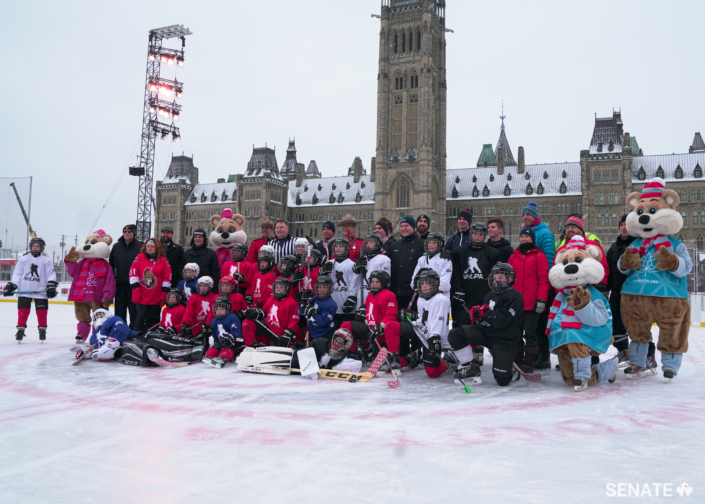 Monday, December 18 — Senator Leo Housakos joins 25 youngsters from the Conseil des écoles catholiques du Centre-Est who were attired in brand new hockey gear, donated by the National Hockey League Players’ Association for a game on the Canada 150 Rink on Parliament Hill. Senator Housakos performed the ceremonial puck drop.