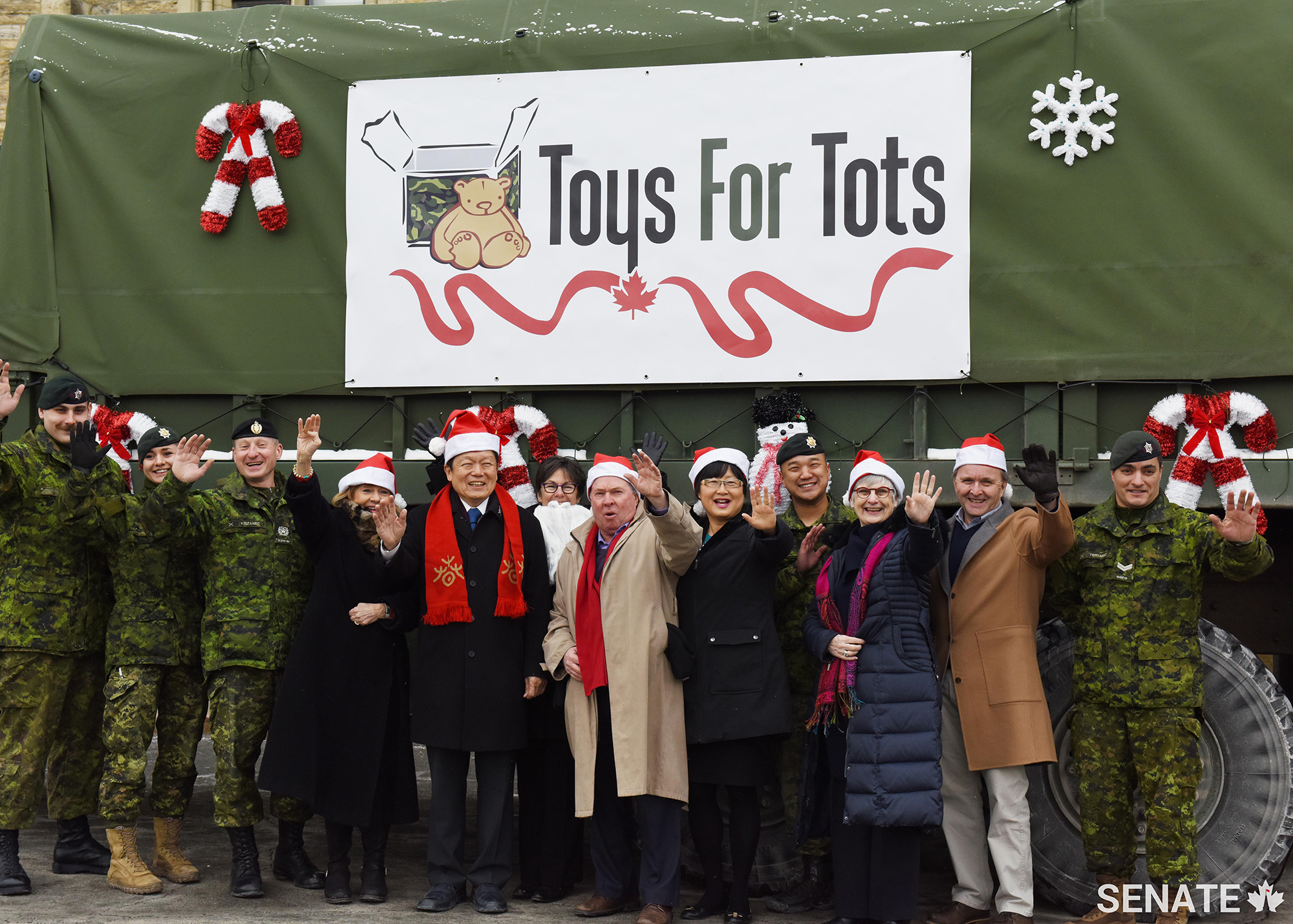 Friday, December 15 — Senators Diane Bellemare, Victor Oh, Kim Pate, Jim Munson, Yonah Martin, Patricia Bovey and Grant Mitchell help load boxes of toys for underprivileged kids in the National Capital Region onto a military truck as part of the Toys for Tots holiday season campaign. The toy drive took place under the leadership of Speaker of the Senate George J. Furey.