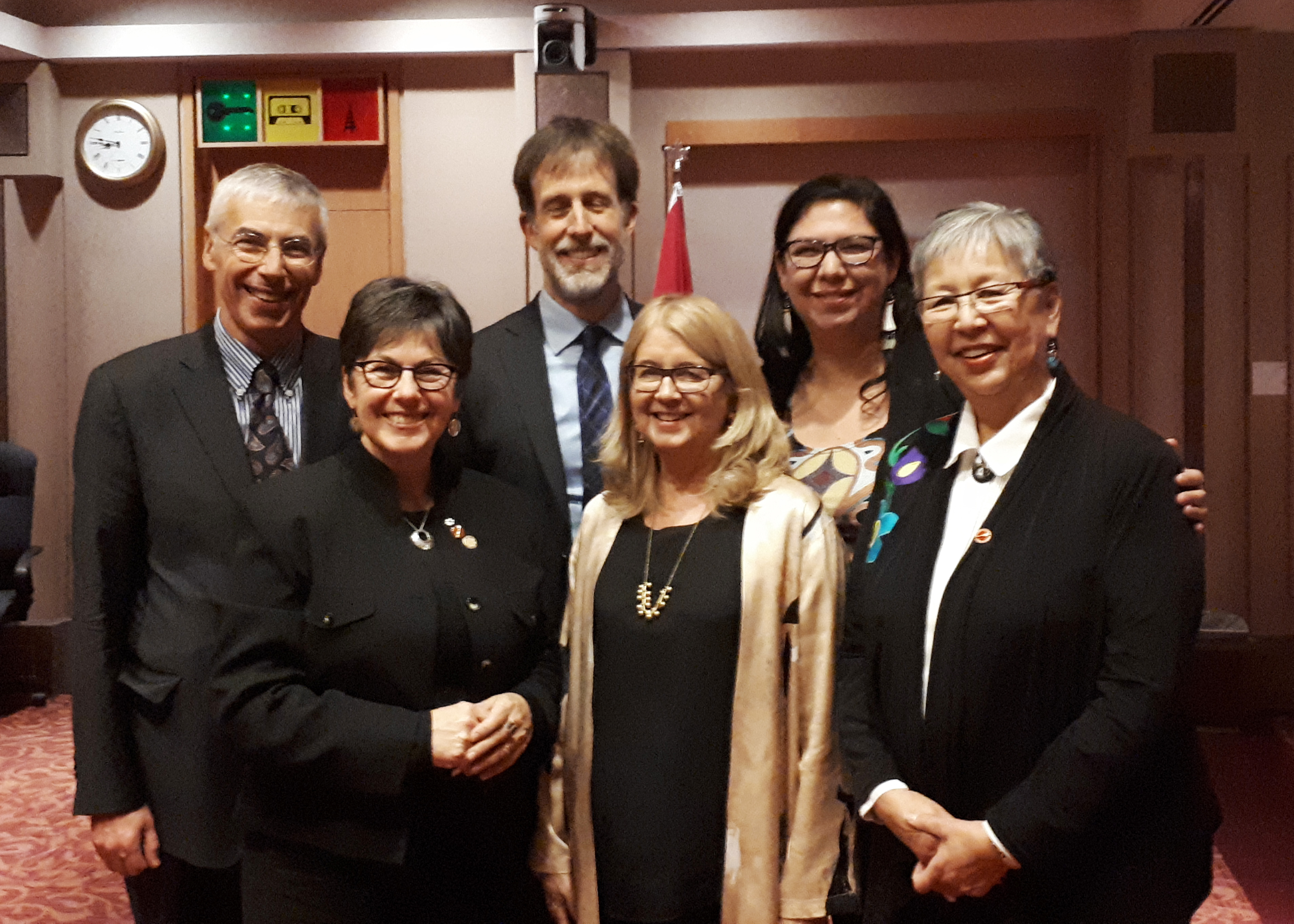 Tuesday, December 12 — Senators Lillian Eva Dyck and Kim Pate host the screening of documentary “Birth of a Family,” which tells the story of four siblings, separated as children during the Sixites Scoop, reuniting decades later. From right to left are National Film Board commissioner Claude Joli-Coeur, Senator Kim Pate, the film’s executive producer David Christensen, the film’s producer Bonnie Thompson, the film’s director Tasha Hubbard and Senator Lillian Eva Dyck.