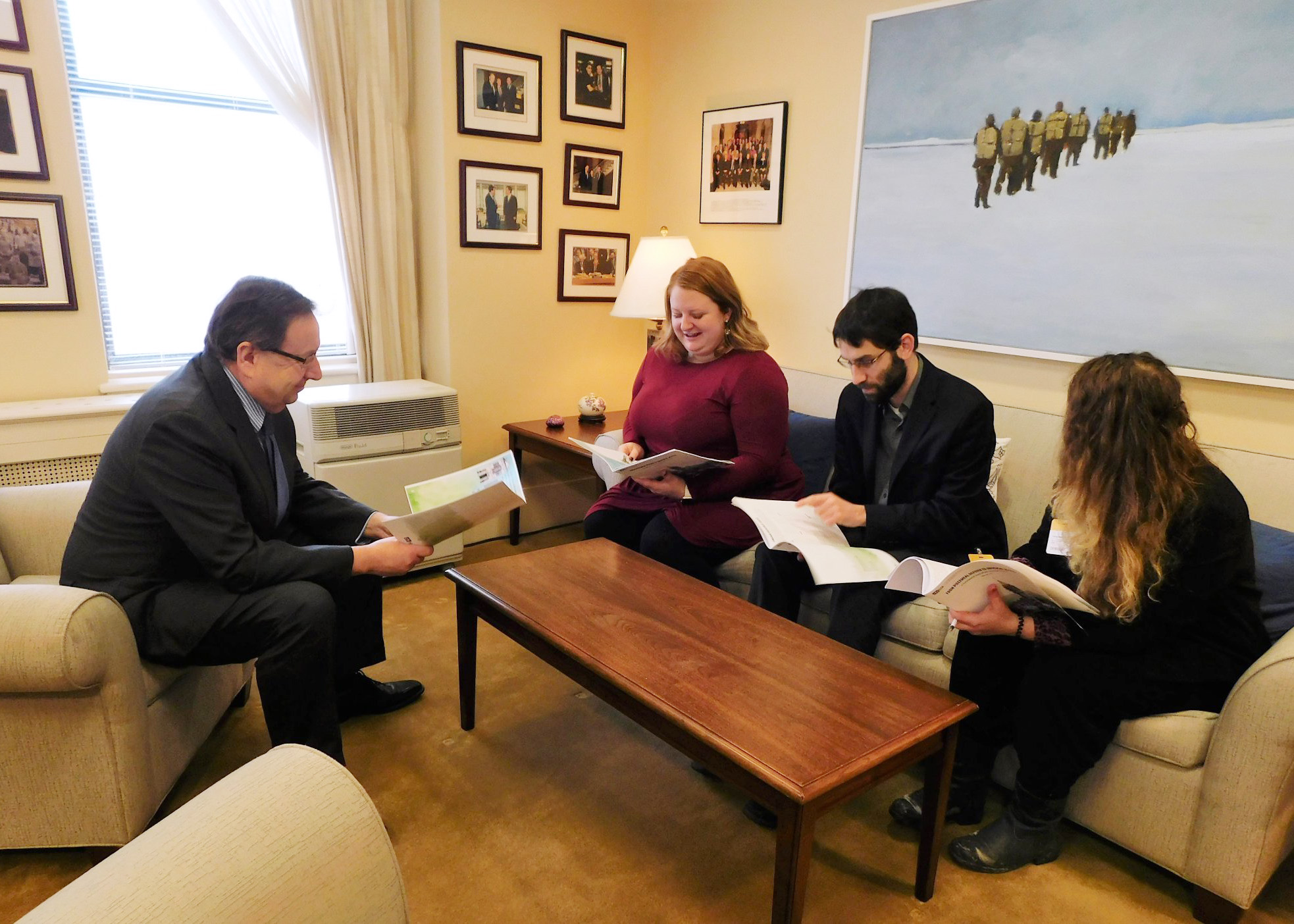 Wednesday, February 7 — Senator Percy E. Downe meets with graduate student representative Ashley McKibbon from the University of Prince Edward Island, along with Peyton Veitch and Sarah Trower from the Canadian Federation of Students to discuss improving accessibility to post-secondary education.