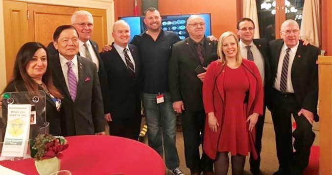 Tuesday, February 6 — Senator Leo Housakos is joined by a group of senators as he hosts a reception for military and first responders following his second reading speech on Bill C-211. Senator Housakos is the Senate sponsor of the bill, which aims to create a federal framework for treating post-traumatic stress disorder.