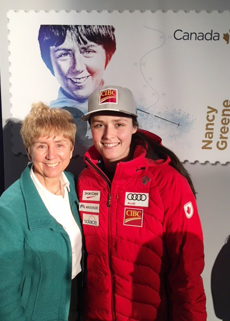 Wednesday, January 24 — Senator Nancy Greene Raine attends the unveiling of her own commemorative Canada Post stamp. The stamp celebrates her gold-medal win for giant slalom at the 1968 Winter Olympics. She is joined here by 2014 Olympic ski cross champion Marielle Thompson.