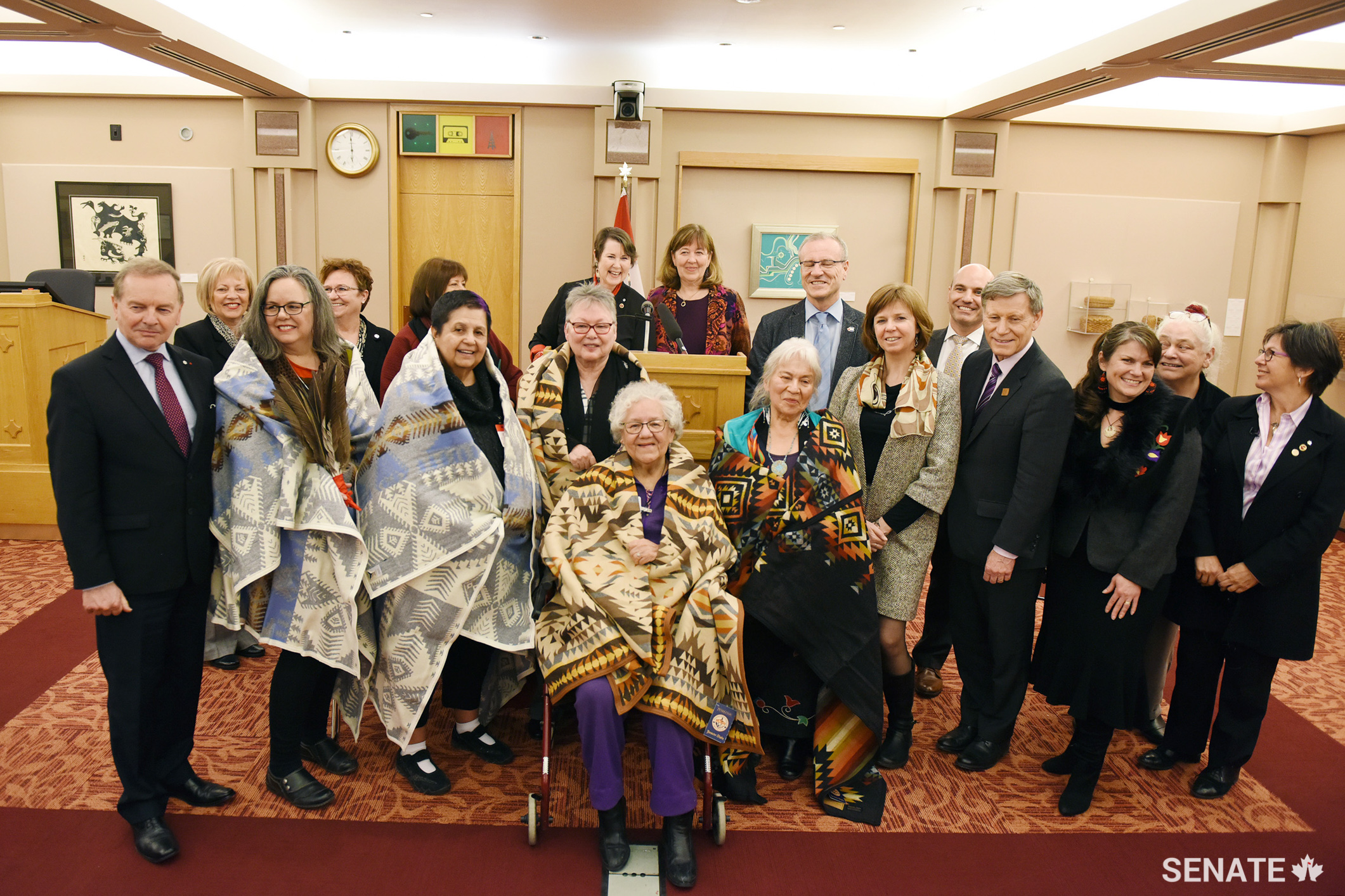 Tuesday, April 17 – Senator Marilou McPhedran is joined by senators, Serge Joyal, Nancy Hartling, Yvonne Boyer, Kim Pate, members of the House of Commons and other community leaders and activists to honour the Famous Six, a group of Indigenous women who have fought for over 40 years to end gender discrimination in the Indian Act. They include Jeannette Corbiere-Lavell, Yvonne Bédard, Senator Sandra M. Lovelace Nicholas, Dr. Sharon McIvor, Dr. Lynn Gehl, who appear here with ceremonial blankets, and Senator Lillian Eva Dyck (not shown here).