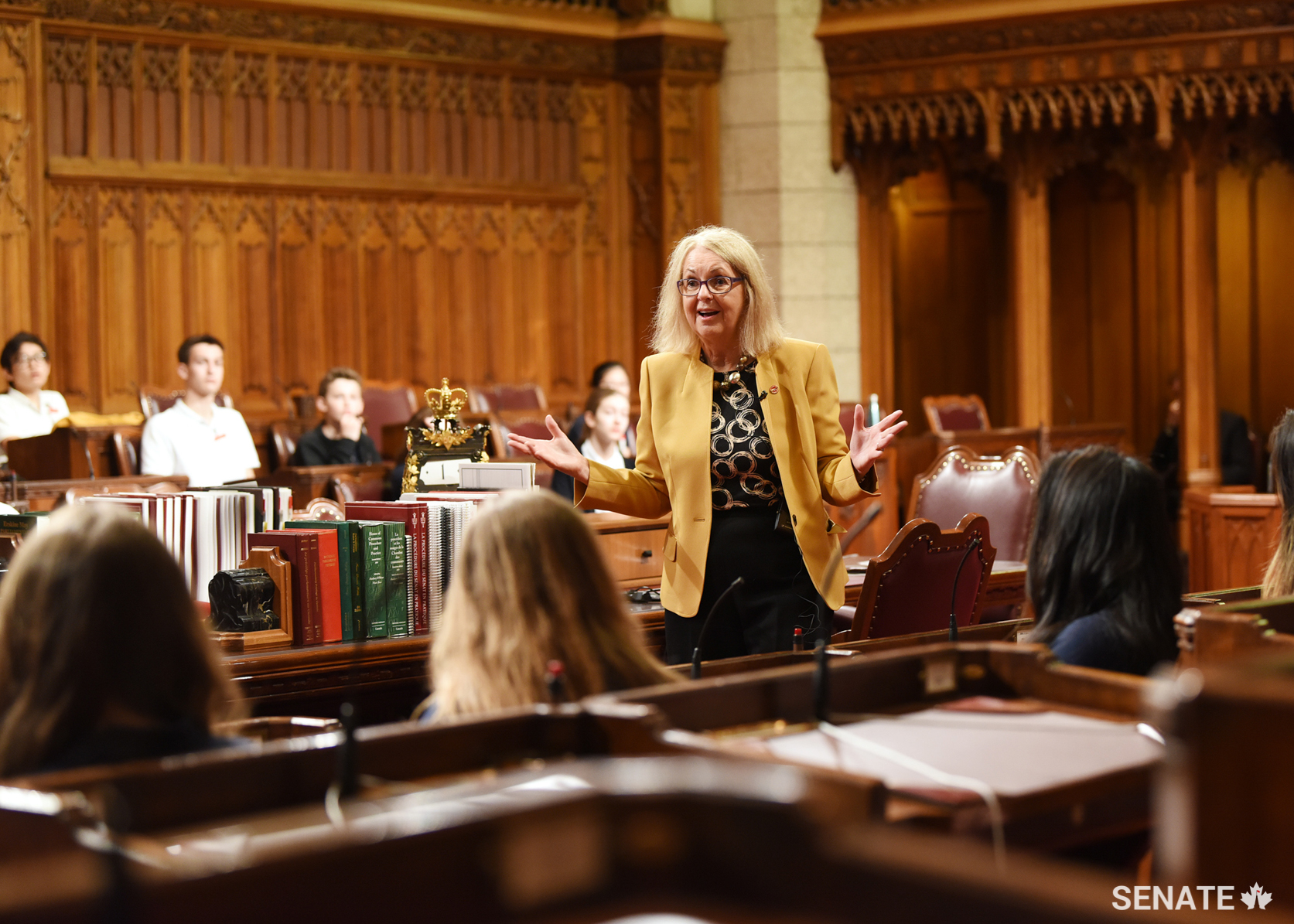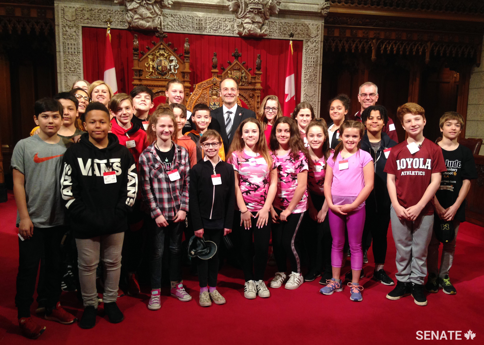Friday, May 4 – Senator Jane Cordy recounts her previous career as a school teacher as she meets with grade eight and nine students from Armbrae Academy in Halifax, Nova Scotia, during their visit to the upper chamber.