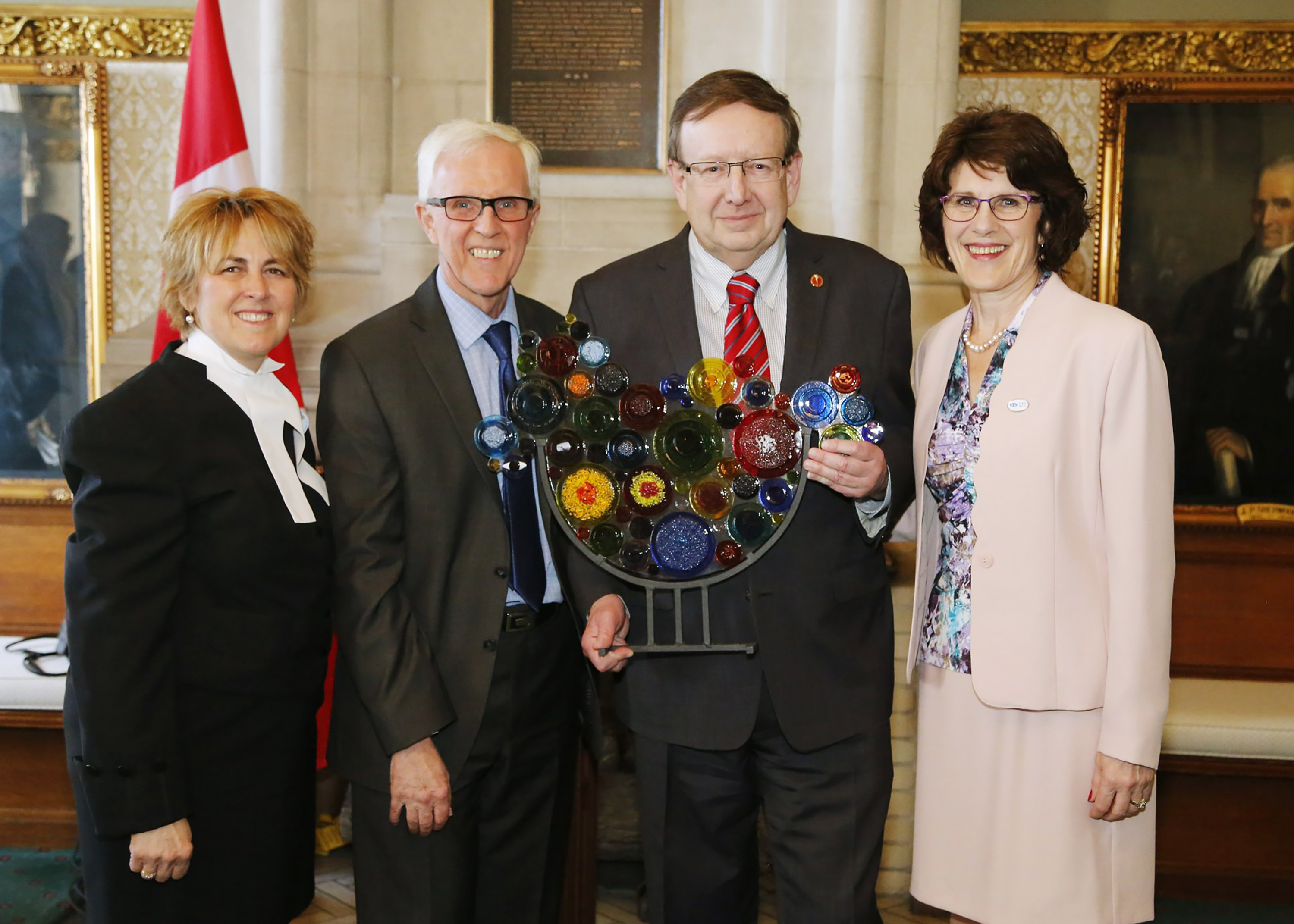 Tuesday, May 8 – Senator Percy E. Downe receives the Vision Champion Award from the Canadian Association of Optometrists during the Vision Forum Event on Parliament Hill. Senator Downe was recognized for his efforts to promote eye care and vision health for Canadians. Senator Downe is pictured with House of Commons Deputy Speaker Carol Hughes, President of CAO Dr. Michael Dennis and CEO of CAO Laurie Clement.