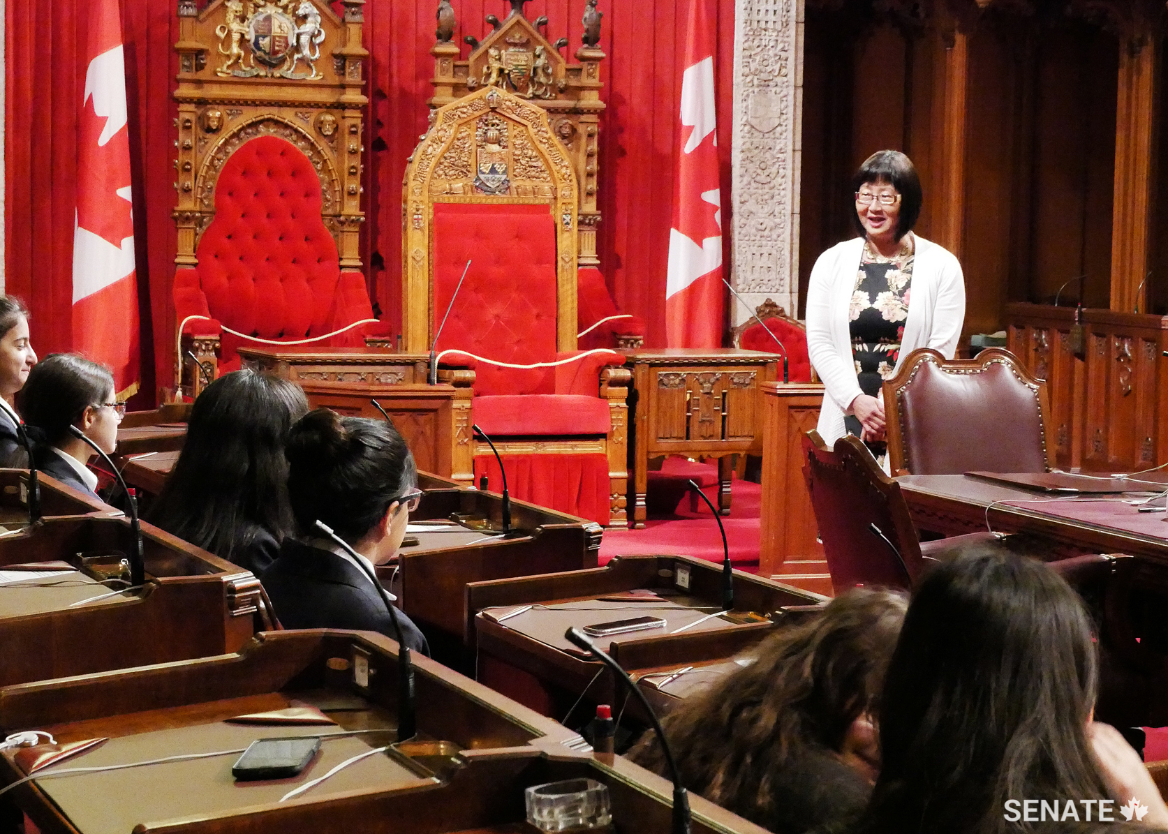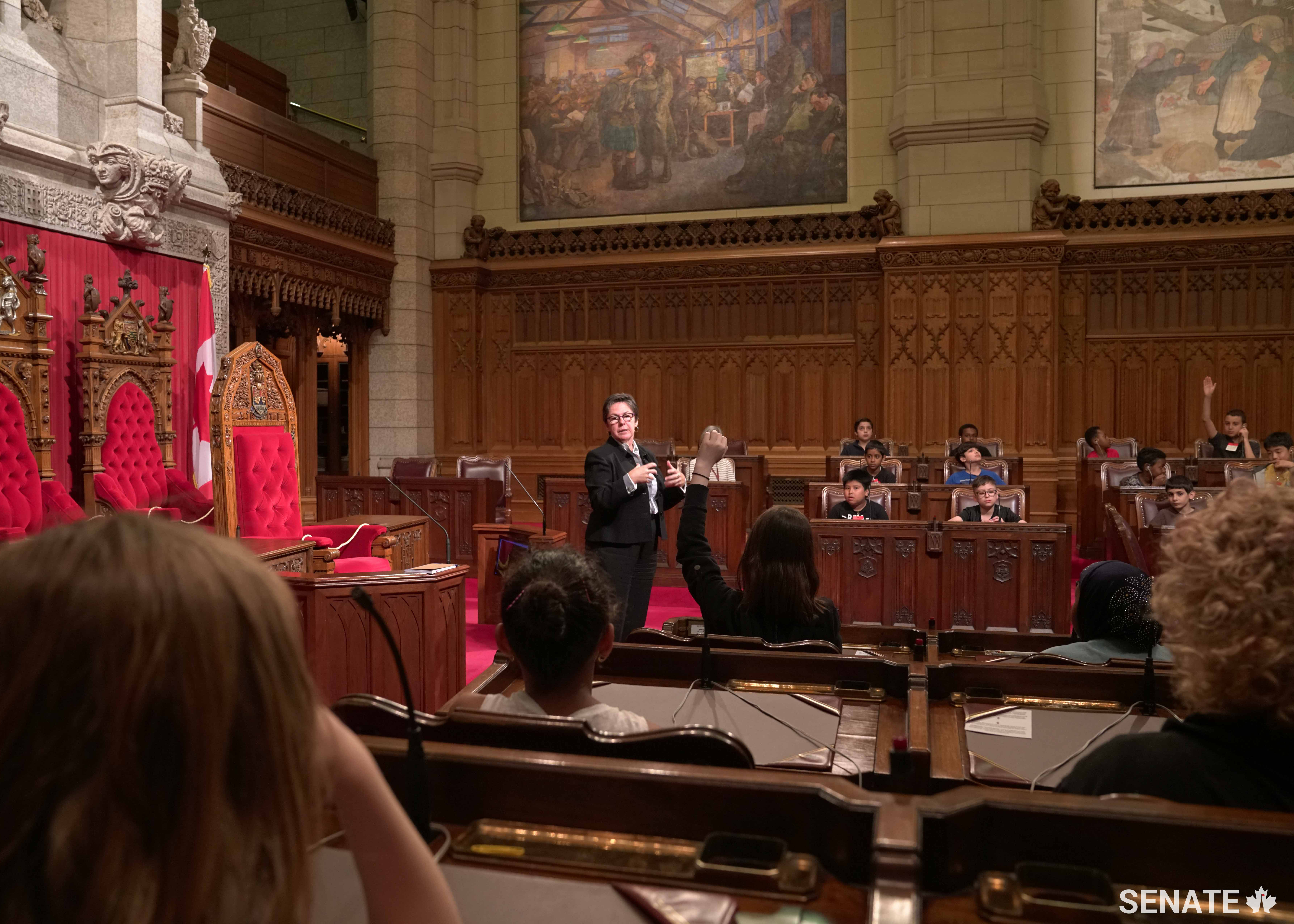 Wednesday, May 23 – Senate Speaker George J. Furey explains the work of the Senate to Socrates-Demosthenes School students visiting the Red Chamber.