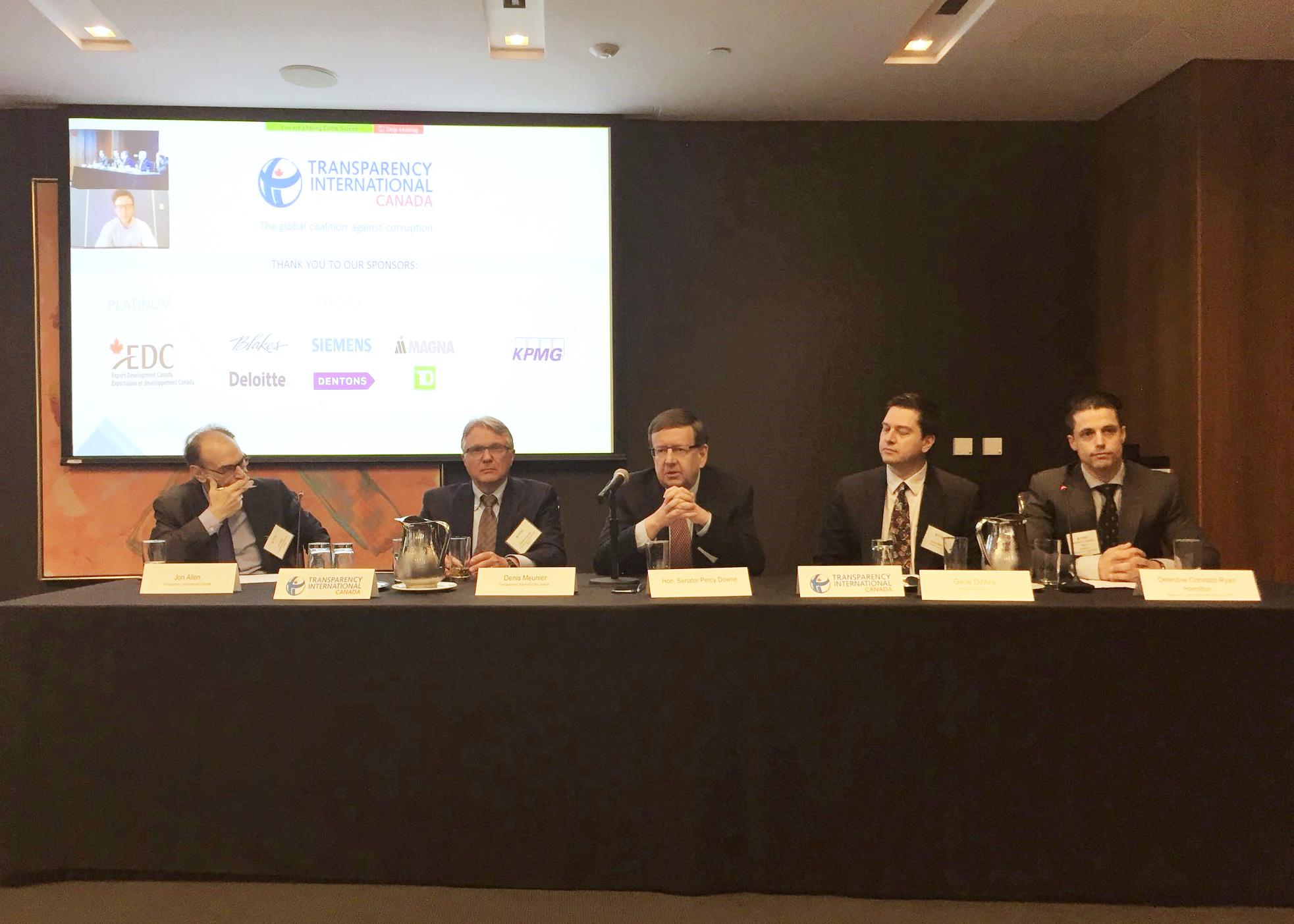 Thursday, May 17 – Senator Percy E. Downe joins a panel at Transparency International Canada's Eighth Annual Day of Dialogue, discussing corporate transparency and monitoring of the tax gap as tools in the fight against overseas tax avoidance. Other panellists included Senior Advisor at Transparency International Canada Denis Meunier, Director of Compliance at Manulife Financial Gene DiMira, Detective Staff Sergeant Robin-Lee Chester Irwin of the Ontario Provincial Police and Research Officer at Transparency International UK Ben Cowdock. The panel was moderated by Jon Allen, a Fellow at the Munk School of Global Affairs.