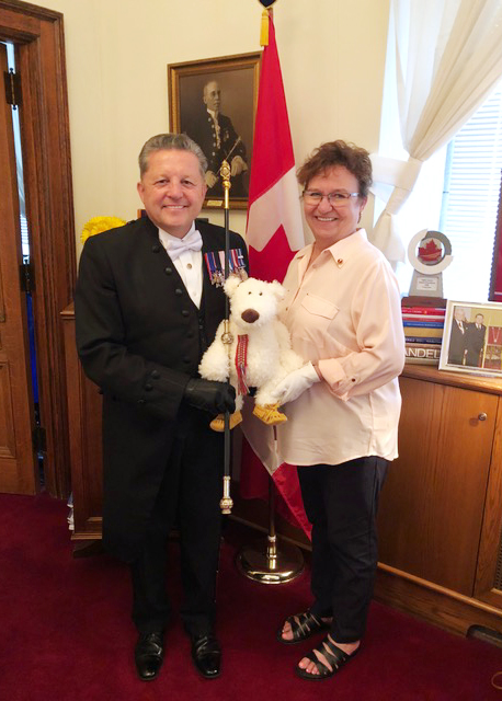 Saturday, June 30 – Senator Yvonne Boyer and Metis Bear (cousin to Spirit Bear) pay a visit to the Usher of the Black Rod, J. Greg Peters, to wish him a Happy Canada Day.