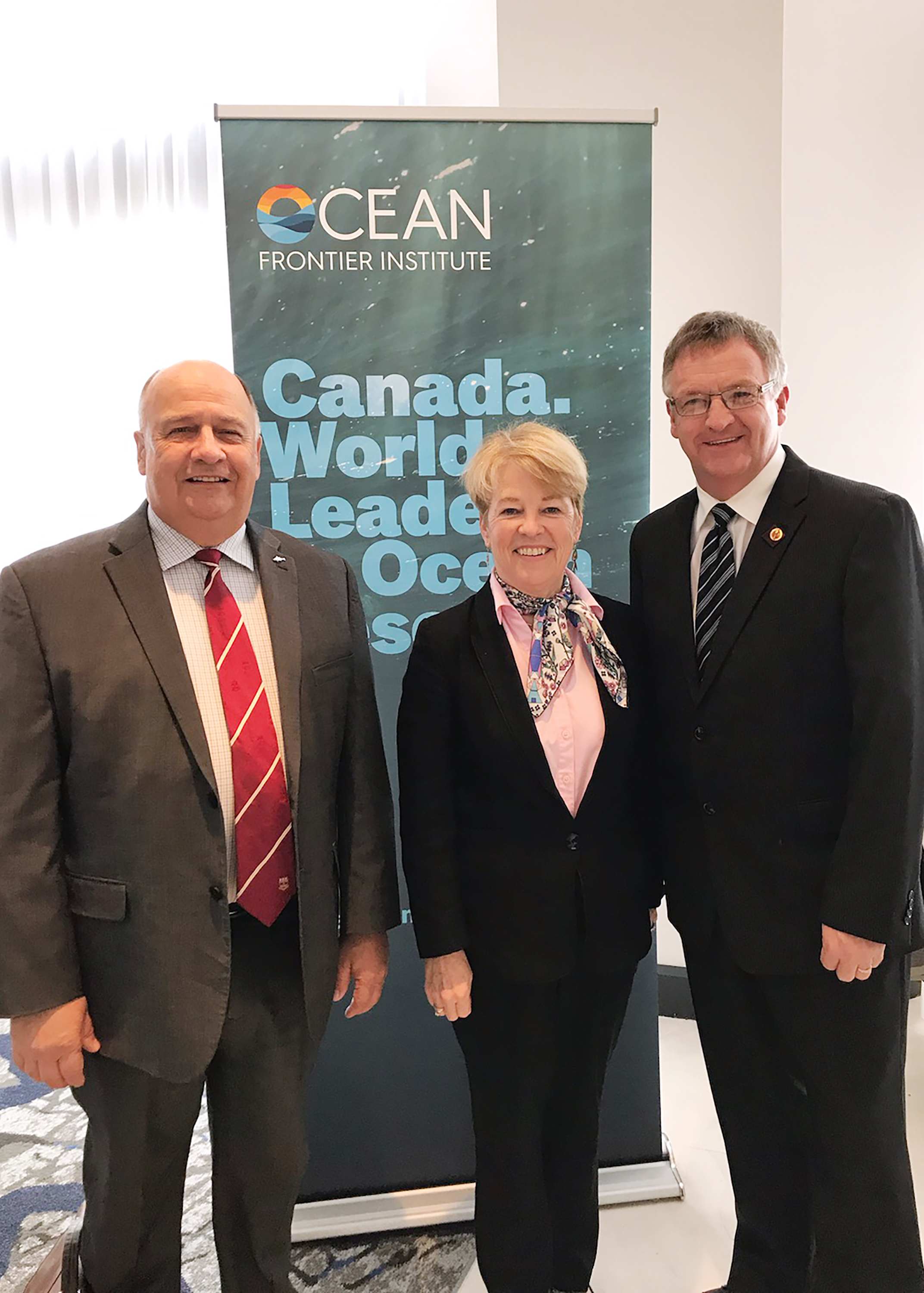 Thursday, October 11 – Senator Fabian Manning, right, presents the findings and recommendations from the Senate Committee on Fisheries and Oceans’ reports on Canada's aquaculture industry at the Ocean Frontier 2018 conference in St. John's, NL. Senator Manning is joined by Memorial University President and Vice-Chancellor Dr. Gary Kachanoski, left, and Ocean Frontier Institute CEO Dr. Wendy Watson-Wright.