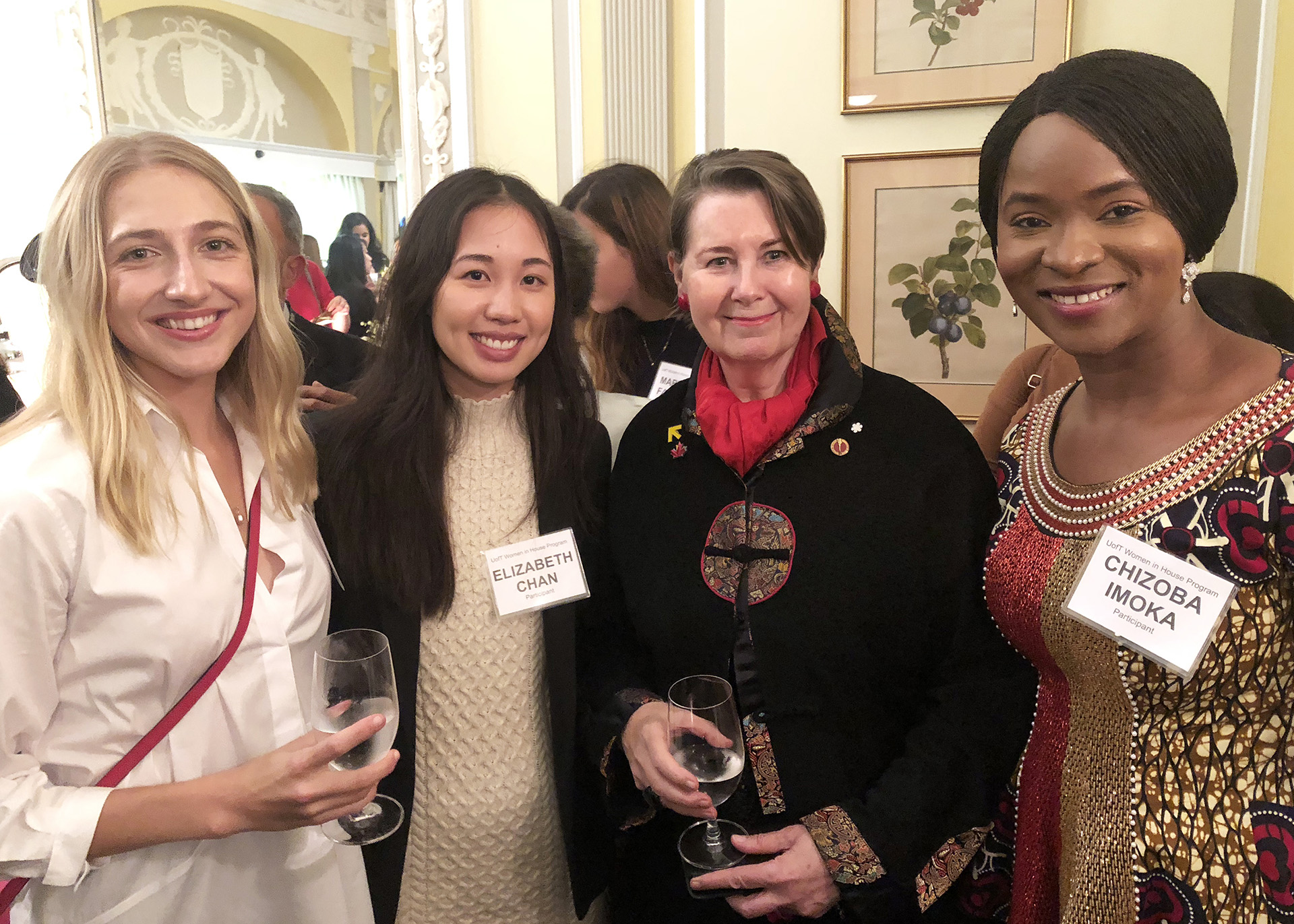 Monday, October 15 – Senator Marilou McPhedran, centre, meets women from the University of Toronto’s Women in the House program at a reception in the Parliamentary Restaurant in Ottawa. The program is aimed at promoting greater female representation in the federal government by inviting female U of T students to shadow a Canadian parliamentarian for a full day on Parliament Hill. From left, Amanda and Elizabeth shadowed Senator McPhedran on Tuesday, October 16.