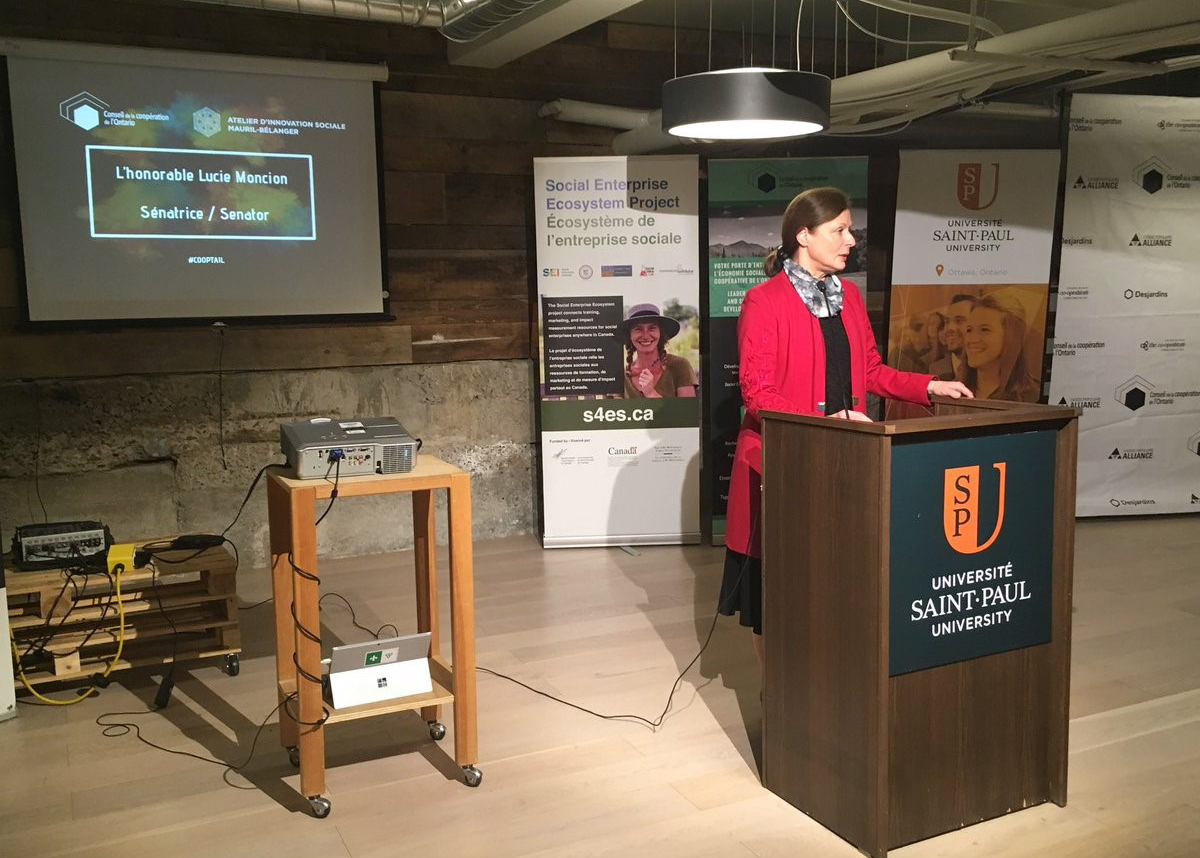 Thursday, January 24, 2019 – Senator Lucie Moncion delivers remarks about the importance of the social economy and the French community at Saint Paul University in Ottawa during an event called “COOPTAIL,” held by the Conseil de la cooperation de l’Ontario.
