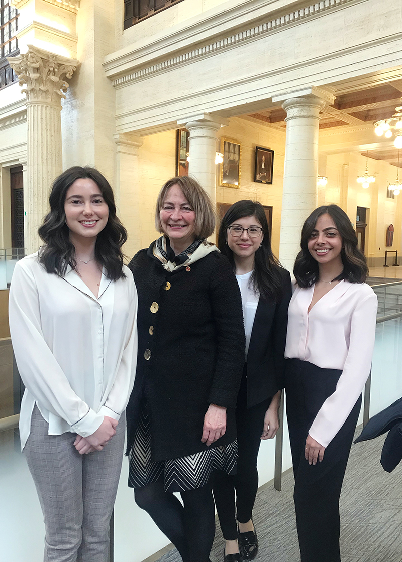Friday, March 22, 2019 – Senator Donna Dasko hosts University of Toronto Women in House participants (from left) Ashley Gold, Paulina Chan, and Simran Sawhey at the Senate of Canada Building. The U of T Women in House program is aimed at promoting greater gender representation in the federal government by inviting female U of T students to shadow a Canadian parliamentarian for a full day.
