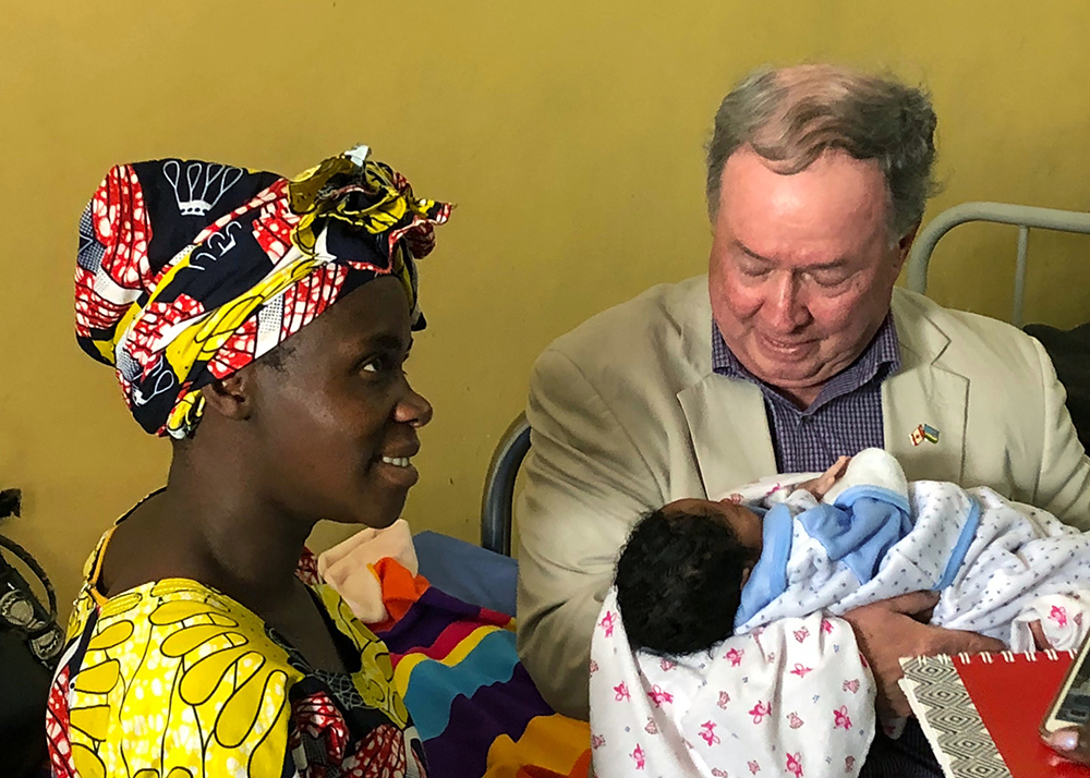 Friday, March 15, 2019 – Senator Jim Munson holds a two-day-old baby at the Ruhombo Health Centre in the mountainous Burera District of Rwanda. The Canada-Africa Parliamentary Association visited the Canadian-funded project while learning about maternal and child health in the country.