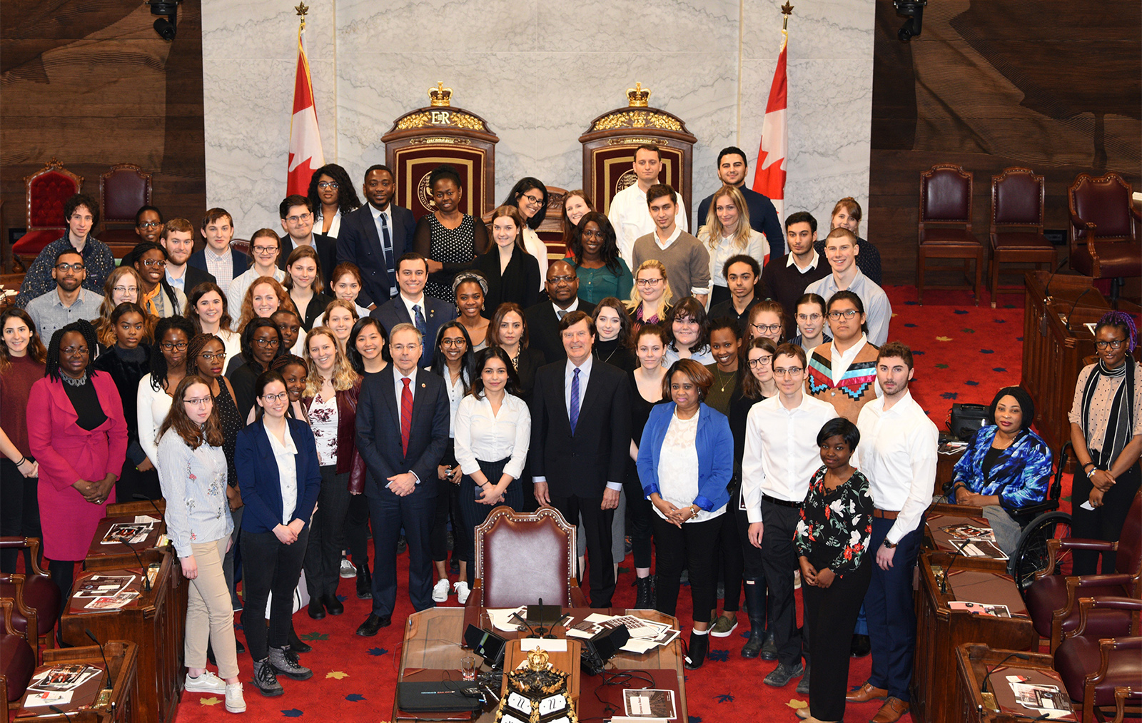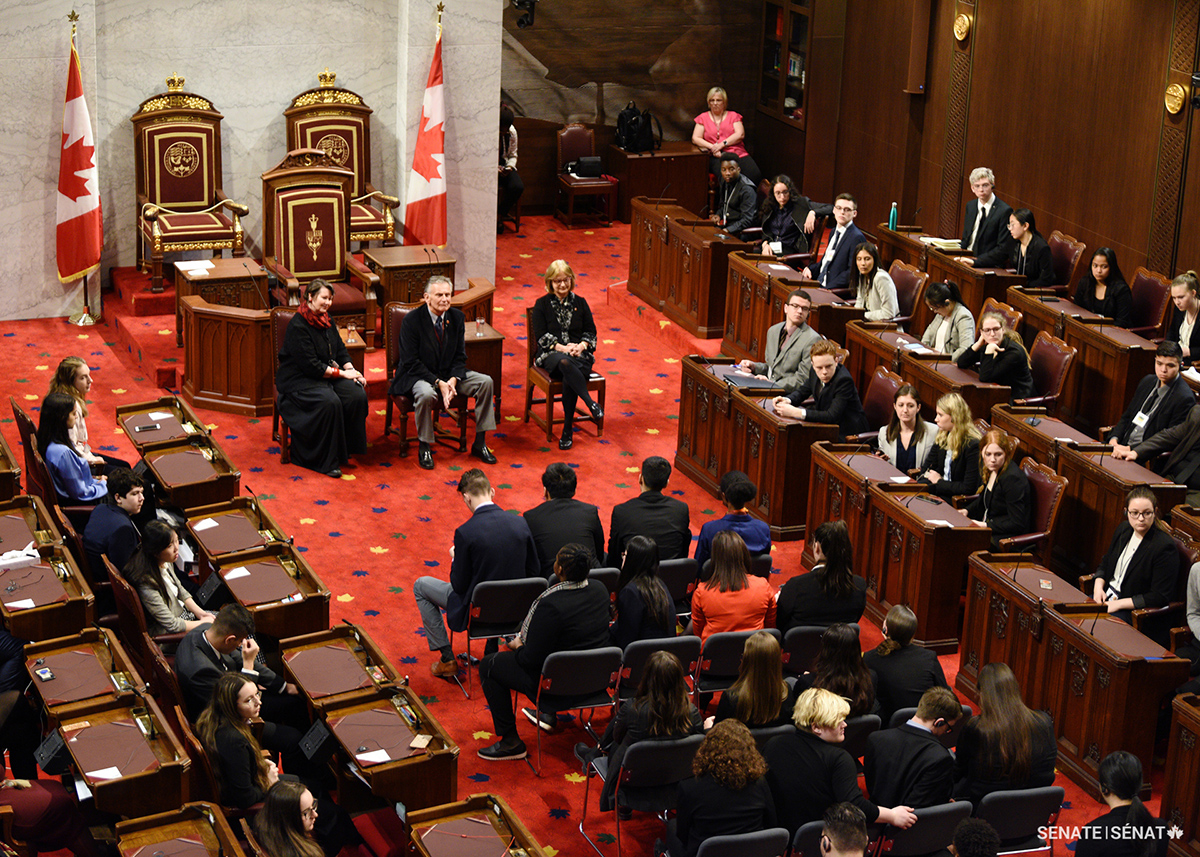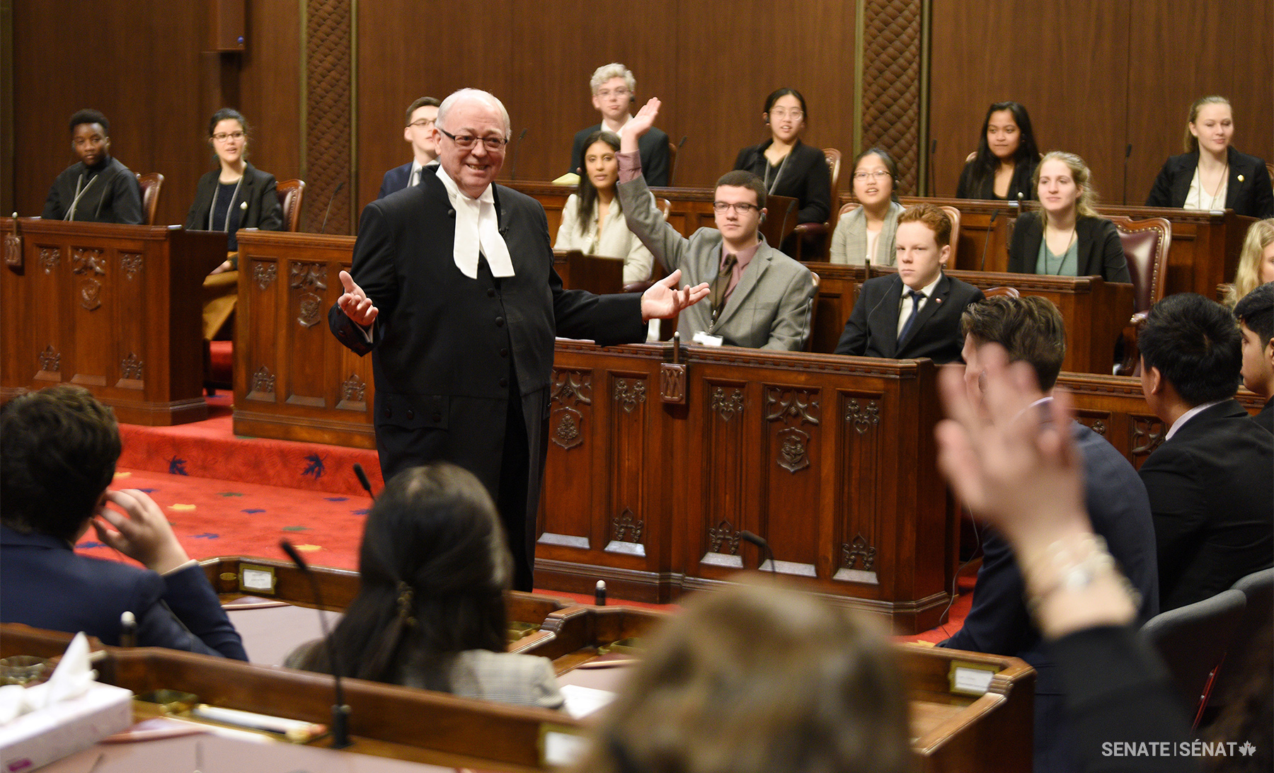 Thursday, March 21, 2019 – Speaker George J. Furey greets participants of the Forum for Young Canadians program in the Senate Chamber and discusses the role of the Senate in Canada’s parliamentary democracy.
