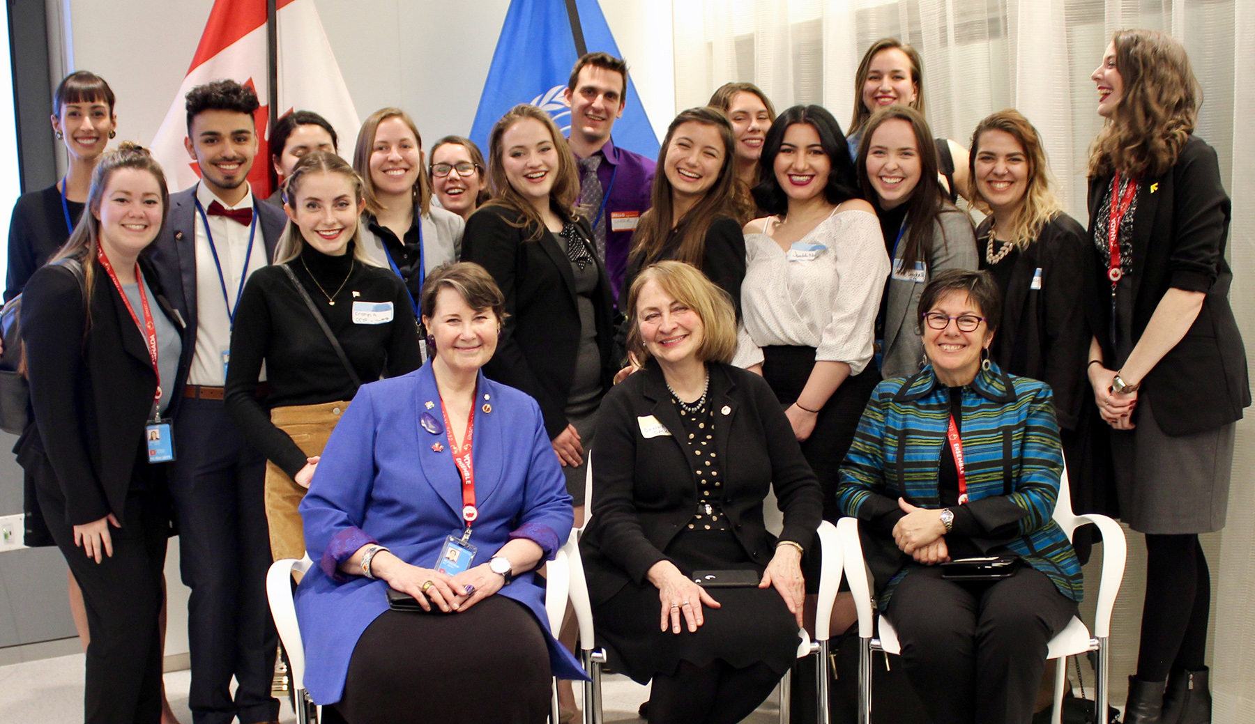 Monday, March 11, 2019 – Members of the Canadian Council of Young Feminists meet with senators Marilou McPhedran, Kim Pate and Donna Dasko — founding members of the Canadian Association of Feminist Parliamentarians — at the Canadian reception during the UN Commission on the Status of Women’s 63rd session.