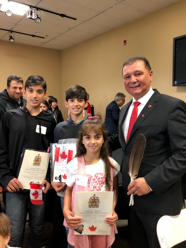 Monday, July 1, 2019 — Senator Brian Francis greets new Canadians at a citizenship ceremony on Canada Day at Skmaqn–Port-la-Joye–Fort Amherst, Prince Edward Island.