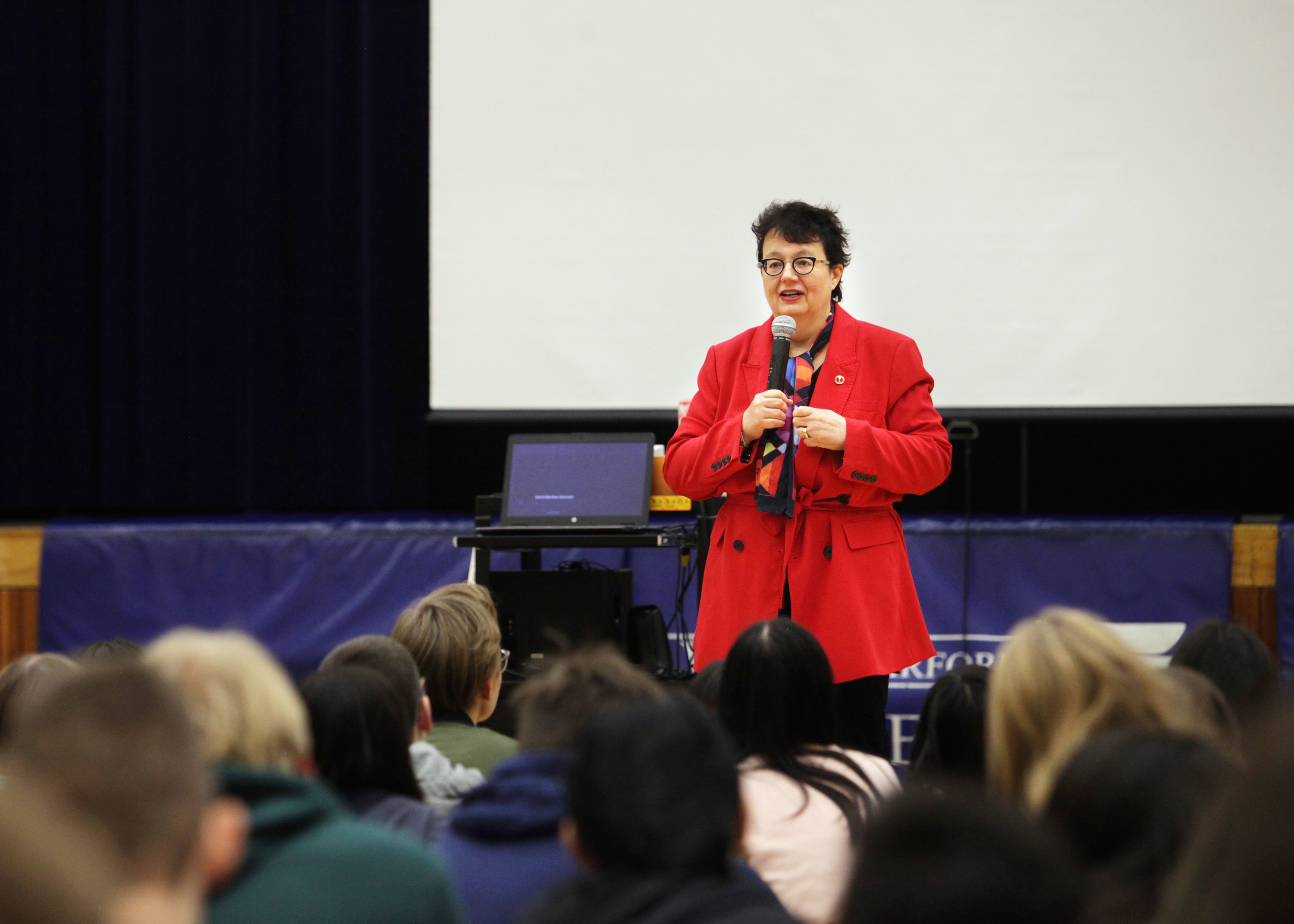 Friday, November 15, 2019—Senator Paula Simons speaks to Grade 9 students at Vernon Barford Junior High School in Edmonton as part of a SENgage youth-outreach event.