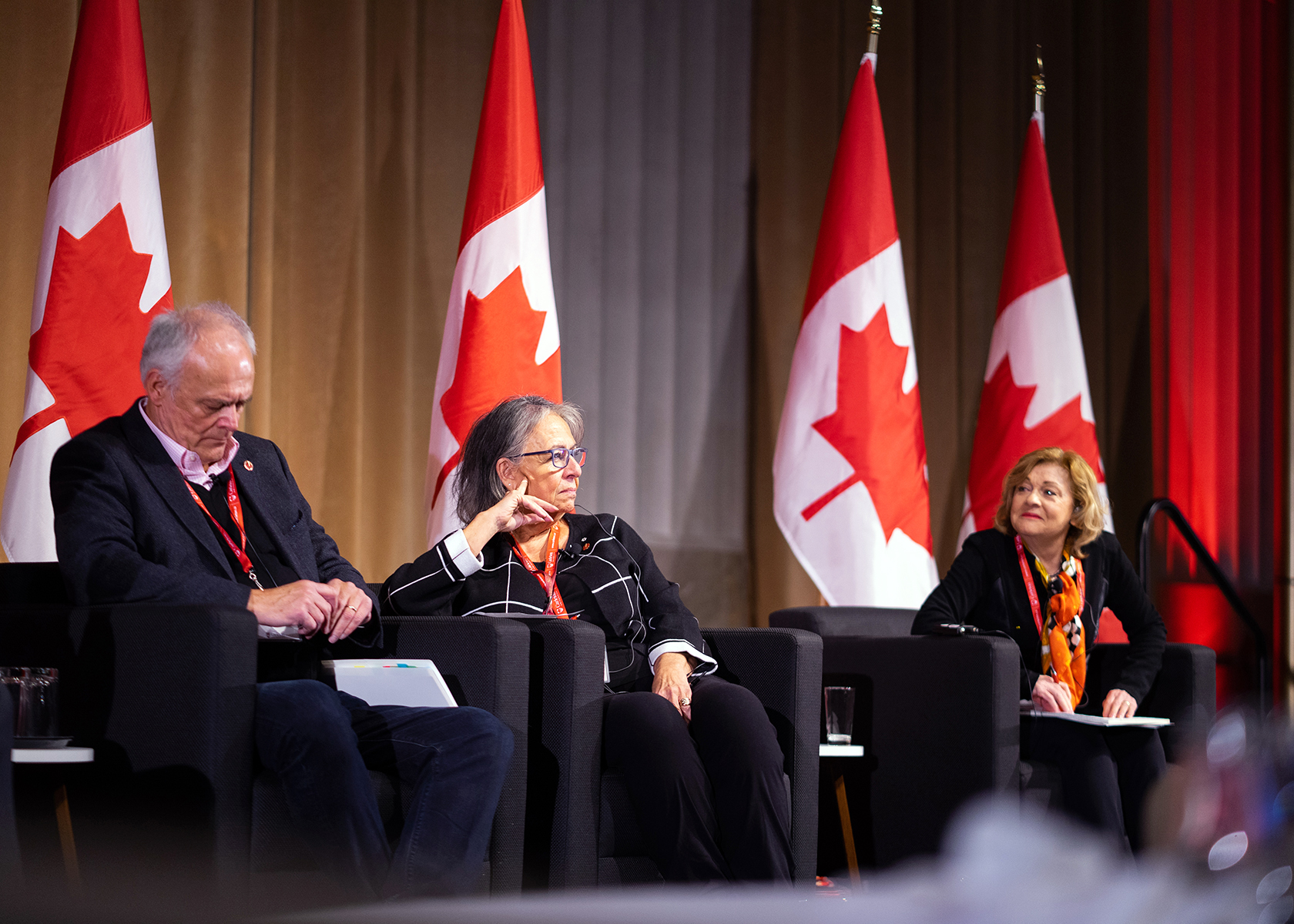 Wednesday, January 22, 2020 — Senators Peter M. Boehm (left), Frances Lankin (centre) and Diane Bellemare (right) participate in a panel discussion as part of an orientation session for new parliamentarians. The two-day orientation was organized by Carleton University’s Initiative for Parliamentary and Diplomatic Engagement.