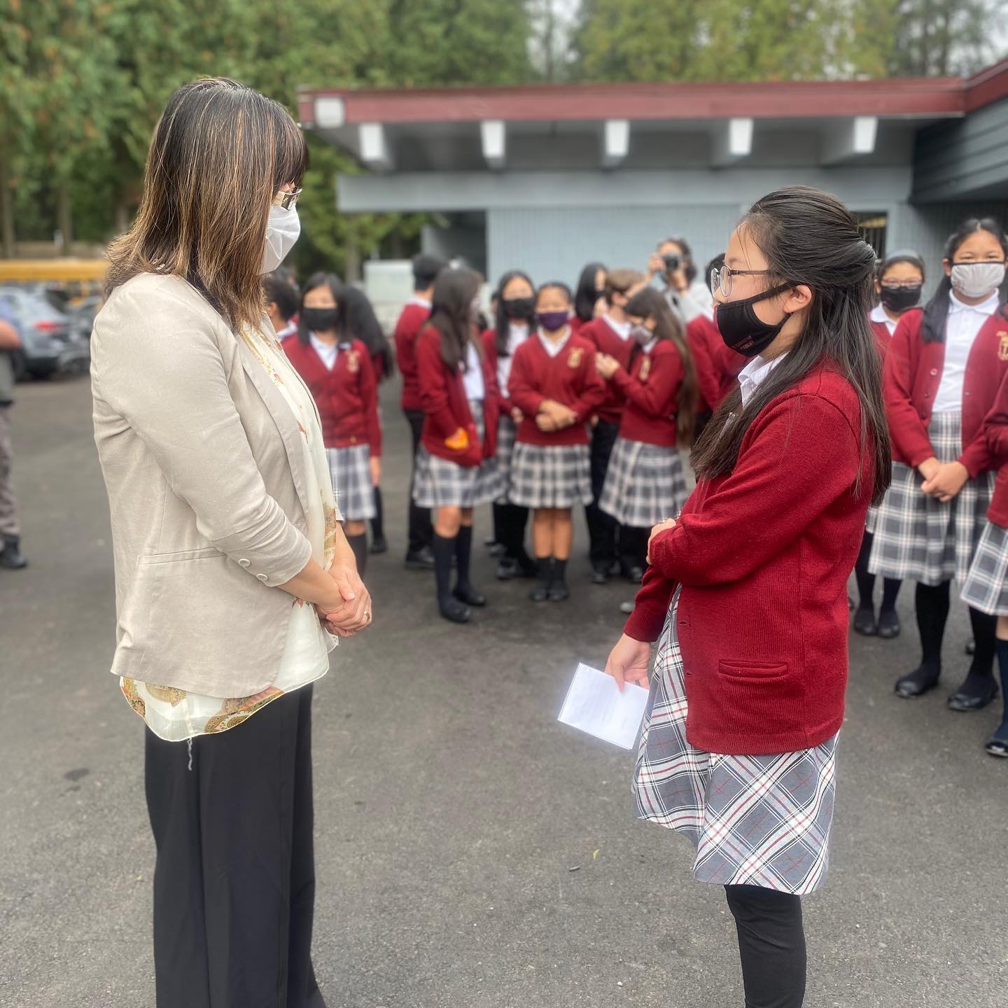 Wednesday, October 7, 2020 — Senator Yonah Martin speaks with a student while attending a ribbon-cutting ceremony for the British Columbia Christian Academy’s new permanent location in Coquitlam, British Columbia