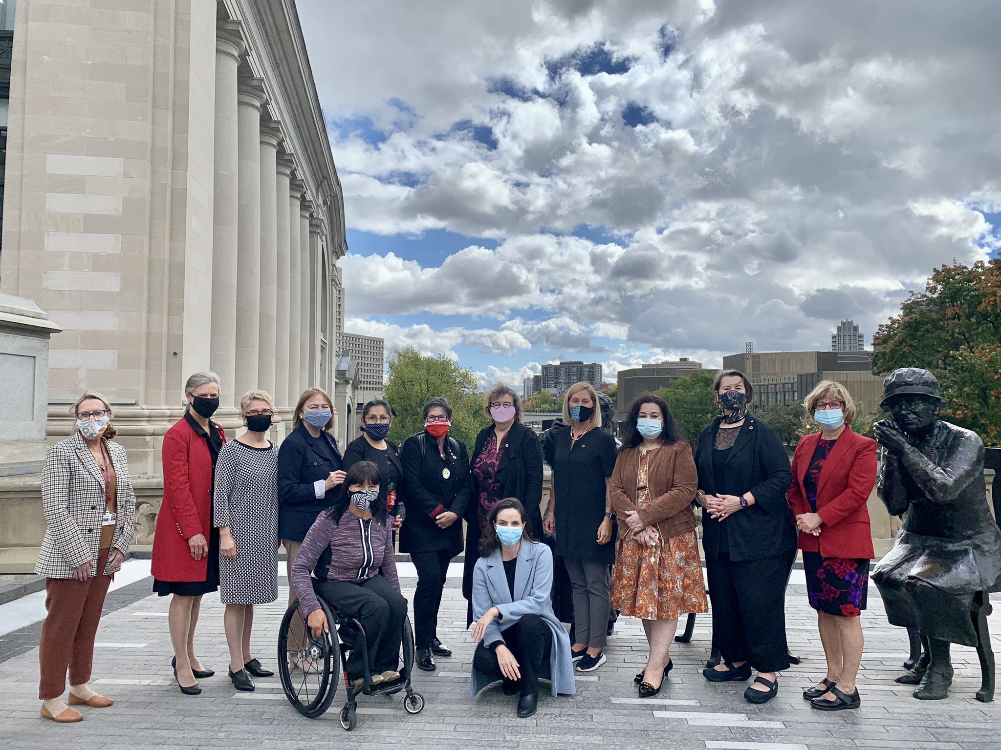 Sunday, October 18, 2020 — Senators Judith Keating, Lucie Moncion, Raymonde Gagné, Donna Dasko, Chantal Petitclerc, Rosa Galvez, Kim Pate, Paula Simons, Patti LaBoucane-Benson, Salma Atauallahjan, Marilou McPhedran, and Julie Miville-Dechêne gather at the Famous Five monument to commemorate Persons Day with Canada’s Ambassador for Women, Peace and Security, Jacqueline O’Neill.