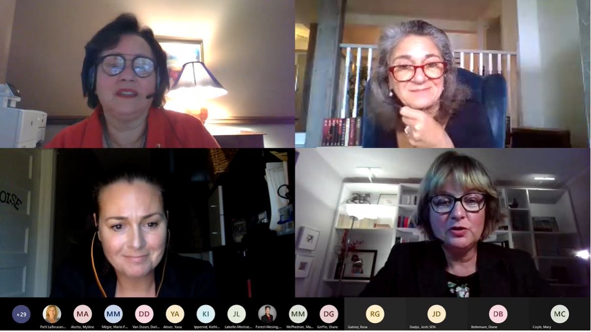 Monday, October 19, 2020 — Senators Rosemary Moodie (top left) and Diane Bellemare (not pictured) host a panel on childcare and a feminist economic recovery with Senator Julie Miville-Dechêne (bottom right), economist Armine Yalnizan (top right) and Carleton University associate professor Jennifer Robson (bottom left).