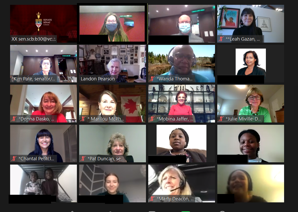 Sunday, October 11, 2020 — Senators Kim Pate, Wanda Elaine Thomas Bernard, Donna Dasko, Marilou McPhedran, Mobina S.B. Jaffer, Julie Miville-Dechêne, Chantal Petitclerc, Pat Duncan, and Marty Deacon participate in a virtual meeting with girls from Girl2Leader on International Day of the Girl.