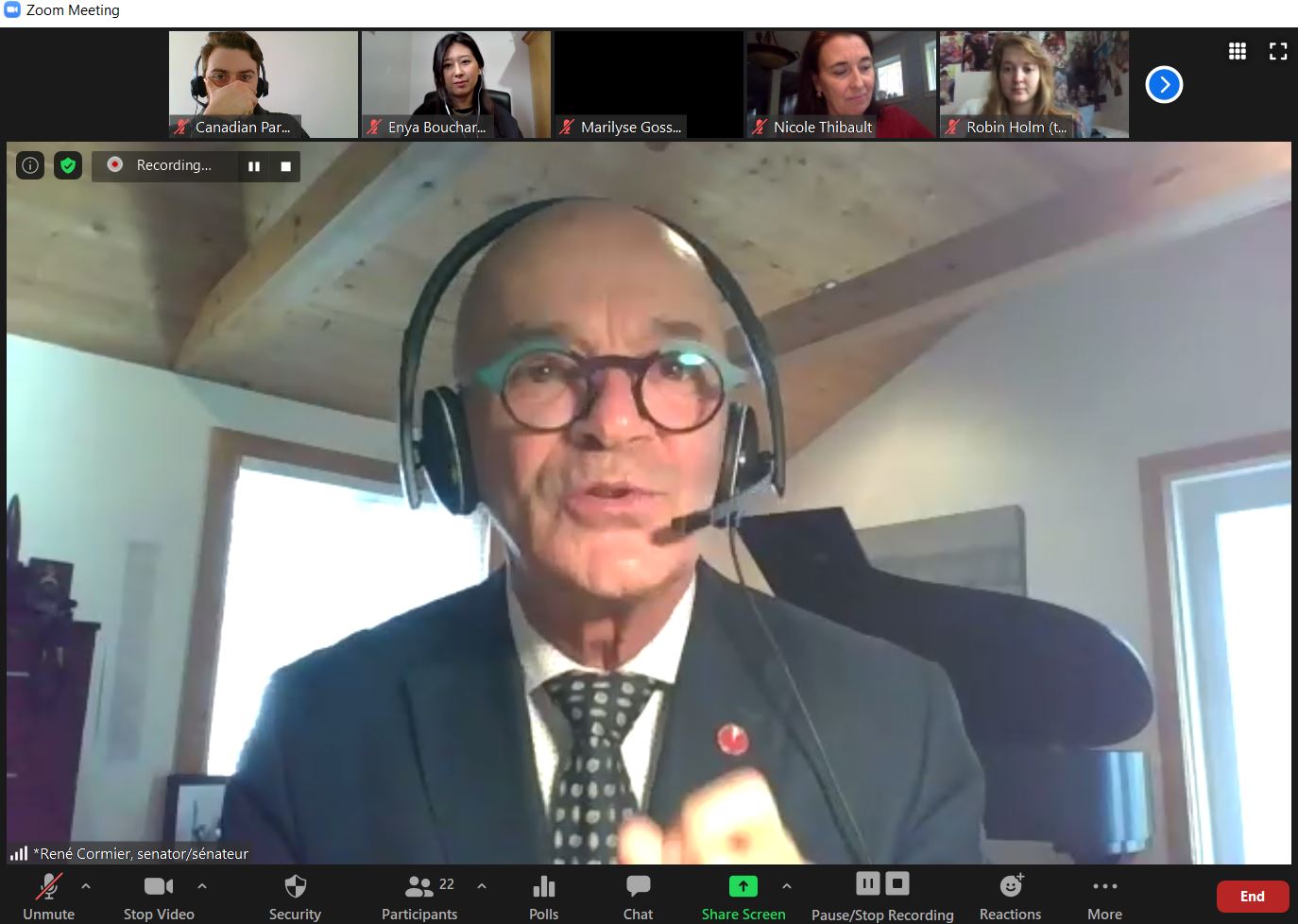 Thursday, October 15, 2020 — Senator René Cormier discusses his work concerning official languages during a session of the Canadian Parents for French virtual conference.