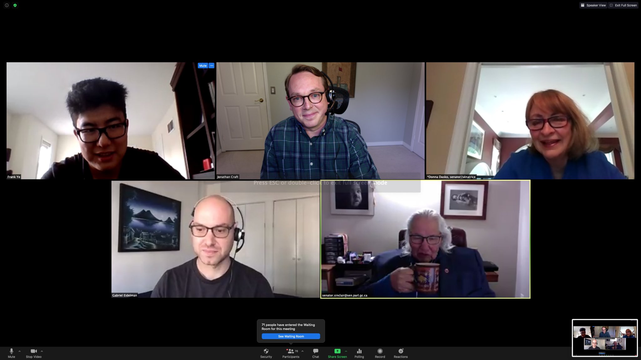 Tuesday, October 6, 2020 — Senators Donna Dasko (top right) and Murray Sinclair (bottom right) speak to 70 students from the Munk School of Global Affairs & Public Policy’s governance and institutions class, where they discussed the role of the Senate and presented their observations on the legislative process during the COVID-19 pandemic.