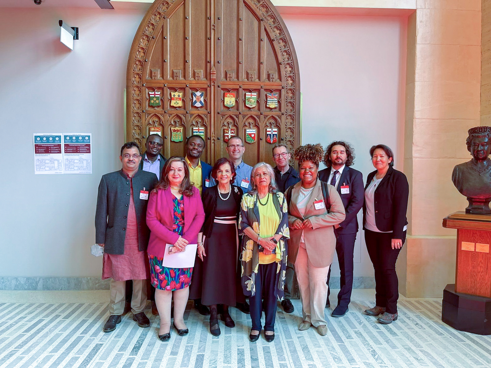 Wednesday, May 11, 2022 — Senators Salma Ataullahjan, Mobina S. B. Jaffer and Ratna Omidvar (front from left, respectively) welcome the winners of the 2021 Global Pluralism Award to the Senate of Canada. Senator Omidvar was a jury member for the award.