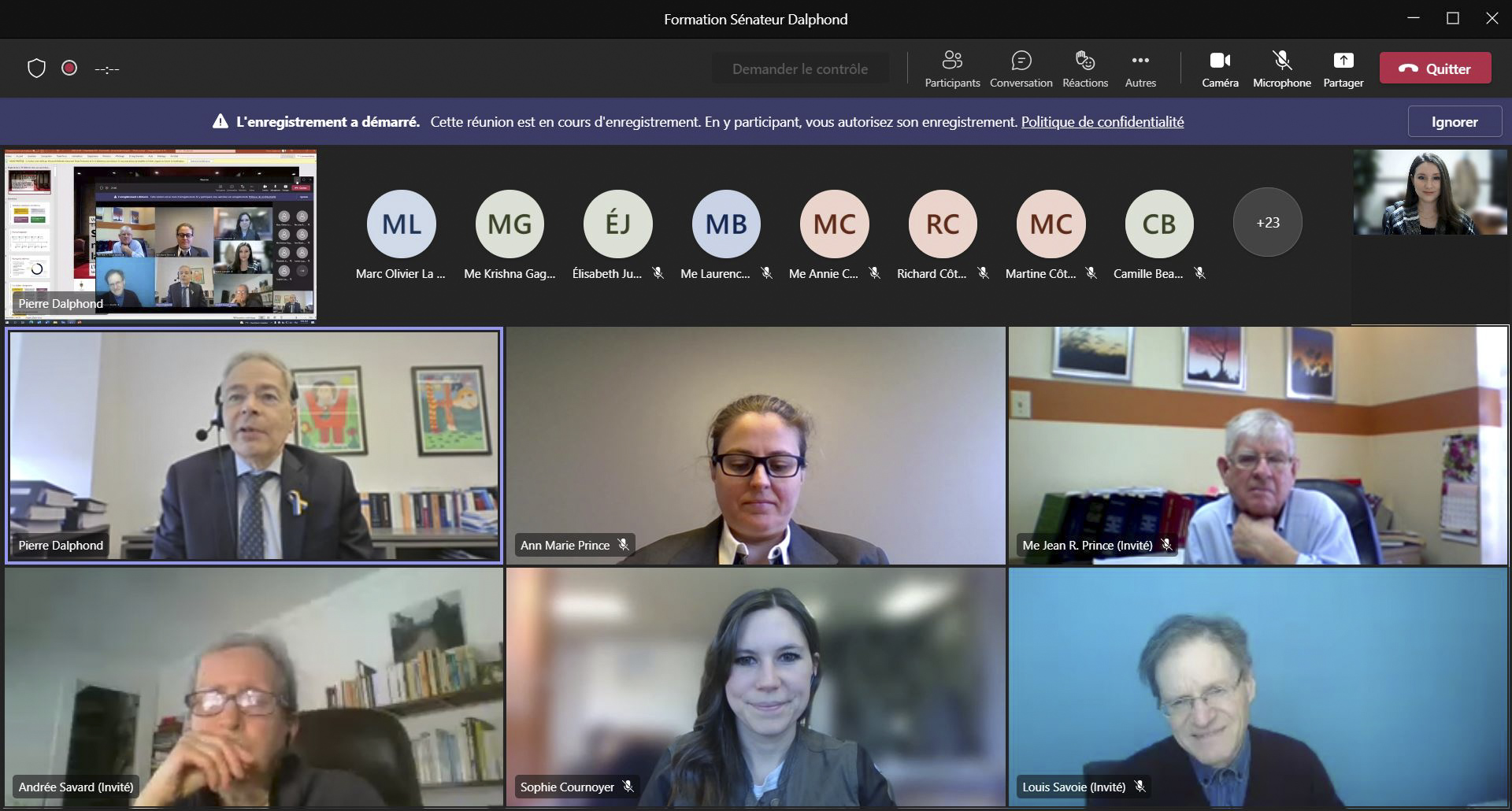 Friday, May 6, 2022 – Senator Pierre J. Dalphond offers a virtual training session to roughly 40 lawyers of Quebec’s Barreau d’Arthabaska on recent amendments to the Divorce Act (Bill C-78), including measures related to family violence.