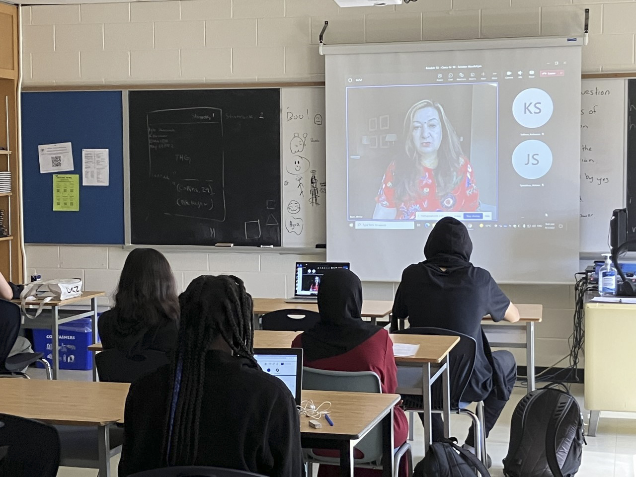 Friday, June 3, 2022 – Senator Salma Ataullahjan speaks to Grade 10 civics students at Erindale Secondary School in Mississauga, Ontario. Students were keen to hear about the work the senator undertakes as chair of the Senate Committee on Human Rights. Senator Ataullahjan also took questions about the Bangladesh Accord on Fire and Building Safety, the United Nations Institute for Disarmament Research, and the impact of Islamophobia in Canada.