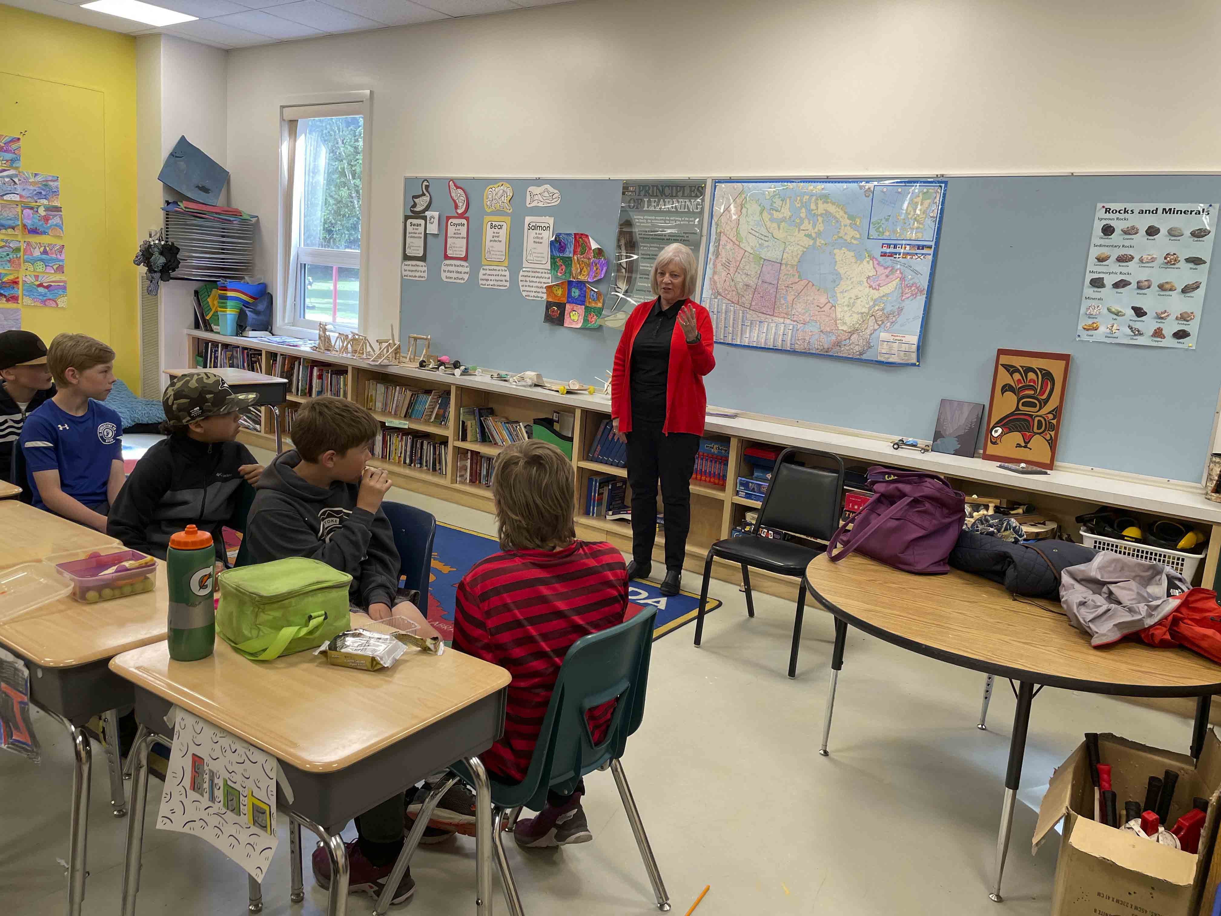 Friday, June 17, 2022 – Senator Nancy J. Hartling visits Grade 5 students at Columbia Park Elementary School in Revelstoke, British Columbia, to explain Canada’s parliamentary system, including the roles of the Senate, the House of Commons and the monarch. The senator offered the class a copy of The Wise Owls, a children’s book written by the Senate of Canada, and a pin of the Platinum Jubilee of Her Majesty Queen Elizabeth II.